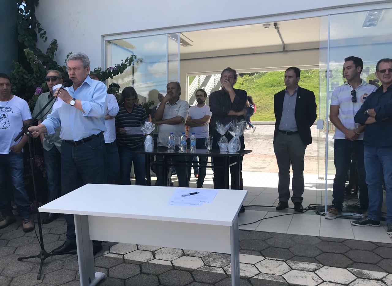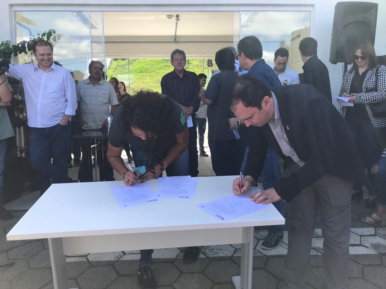 A ordem de serviço nº: 011/2020 foi assinada oficialmente pelo prefeito Antonio Ceron na tarde desta quinta-feira (27 de fevereiro), em cerimônia na sede do Instituto Federal de Santa Catarina (Ifsc), prestigiada também pelo vice-prefeito, Juliano Polese; secretário do Planejamento e Obras, João Alberto Duarte; diretor geral do Ifsc, Thiago Meneghel; presidente do Instituto Orion, Valmir Tortelli; representante da empresa Construtora Evoluta Ltda., Thiago Hinckel; secretários e executivos municipais; vereadores; lideranças de bairros; alunos do Instituto Federal; profissionais do Orion, e comunidade. O documento foi entregue à terceirizada pela aluna do curso de análises químicas, Mariéle Correia Lucrécio.