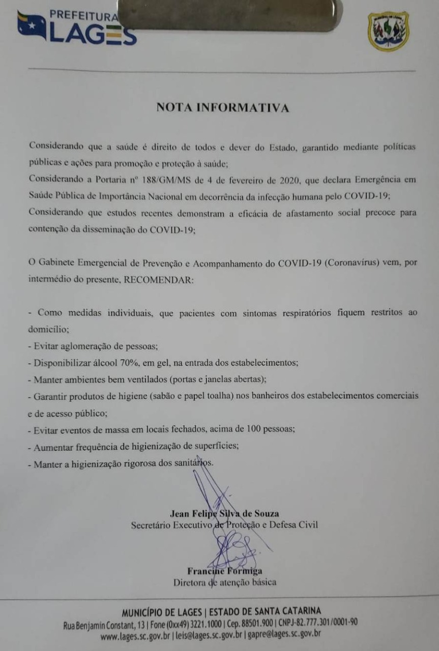 “Graças a Deus, o único caso suspeito que Lages tinha até então foi descartado no fim da tarde desta sexta-feira. Porém, não podemos baixar a guarda, pois é só o começo de uma longa batalha que o Brasil vai enfrentar. Sem pânico, mas precisamos estar preparados, daí a importância da formação deste gabinete emergencial unindo forças e conhecimento técnico para garantir o melhor atendimento possível à nossa gente”, diz o prefeito Antonio Ceron.