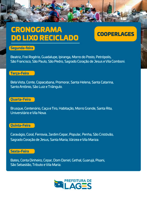 Normalmente e diariamente é feita a coleta seletiva de materiais recicláveis por caminhões via contrato firmado entre a Cooperlages e a prefeitura, através da Semasa, que custeia o contrato por intermédio da taxa de coleta de lixo paga pelos cidadãos. A Cooperativa tem a responsabilidade sobre os veículos e pelo transporte e destinação final dos materiais. A coleta seletiva é diária (de segunda-feira a sábado) no Centro, no período noturno, e em cada uma das cinco regiões de bairros é feita uma vez por semana conforme programação já estabelecida.