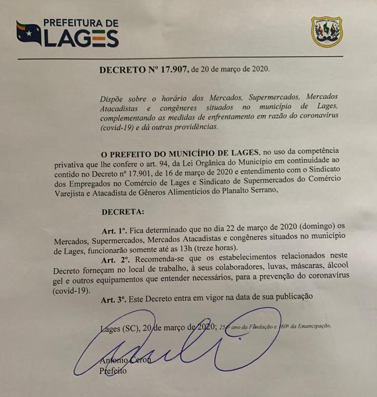 O prefeito de Lages, Antonio Ceron, decretou no fim da tarde desta sexta-feira, dia 20, que os mercados, supermercados, atacadistas e congêneres da cidade funcionem no máximo até as 13h no domingo, 22.