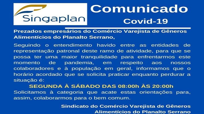 O comunicado parte do Sindicato do Comércio Varejista de Gêneros Alimentícios do Planalto Serrano (Singaplan), que entrou em consenso entre as entidades de representação patronal em respeito aos colaboradores e à população em geral. A medida será mantida enquanto durar o período crítico de transmissão do vírus.