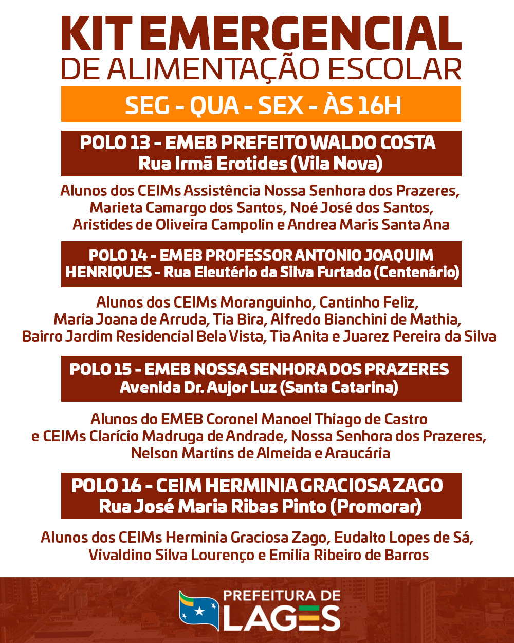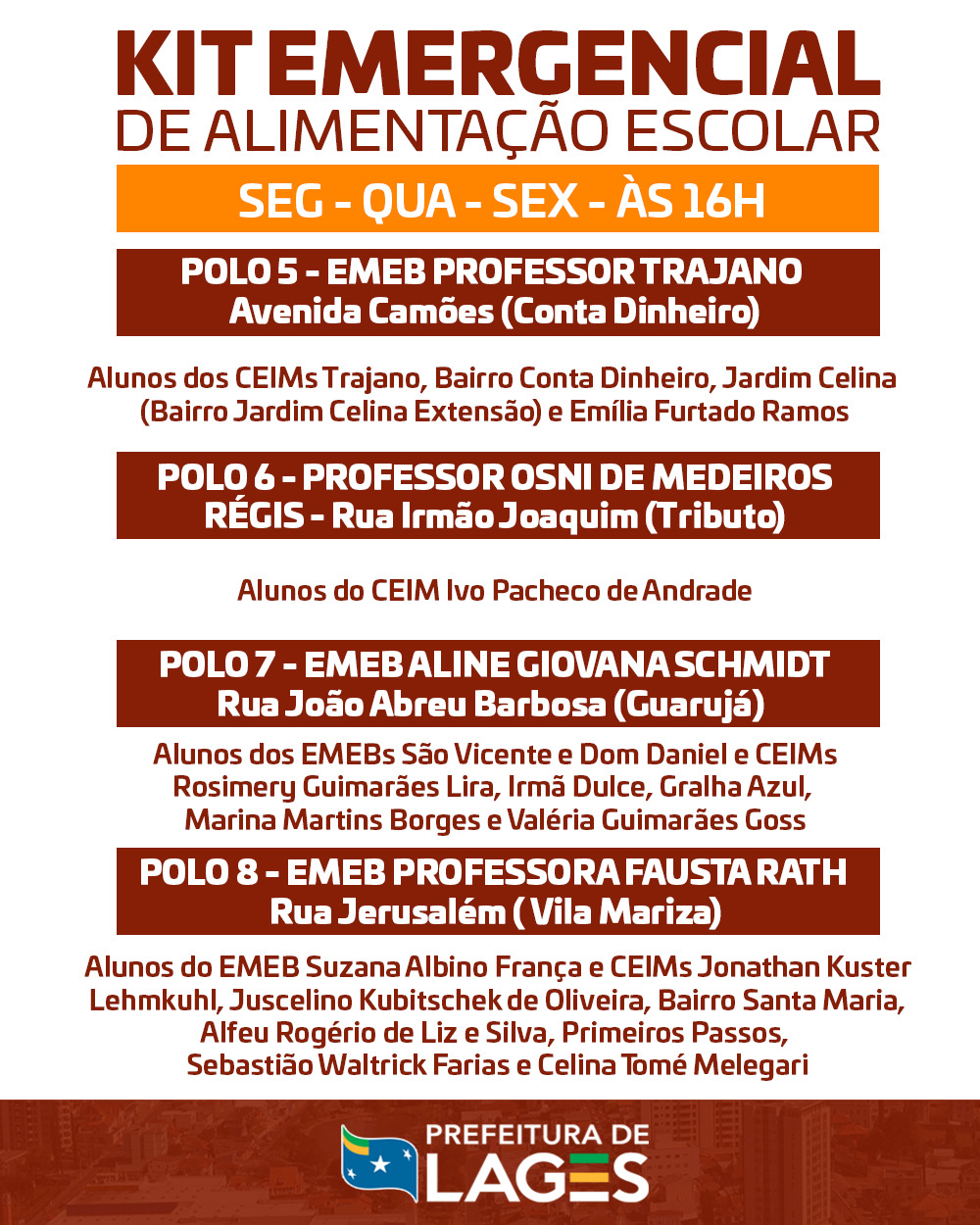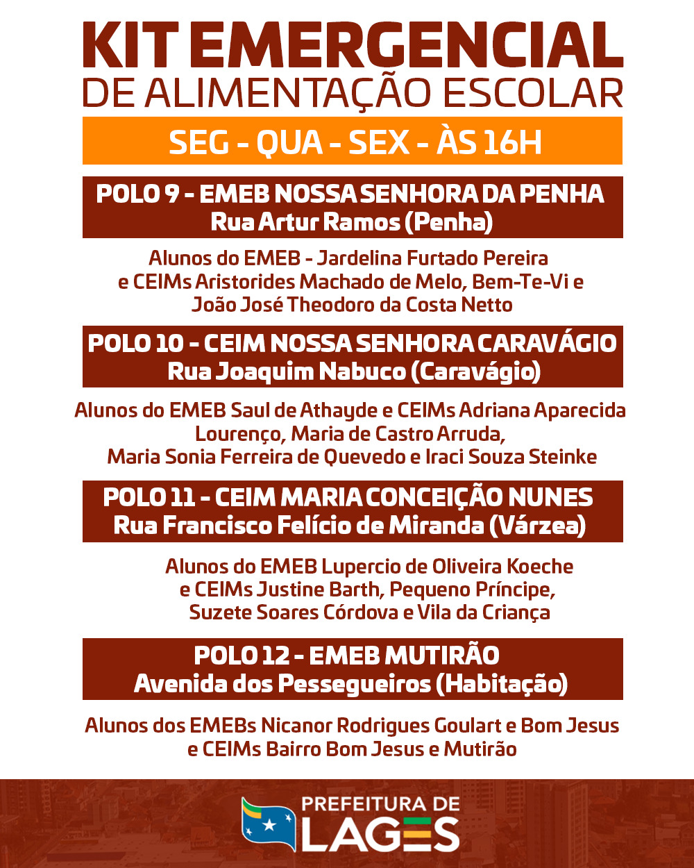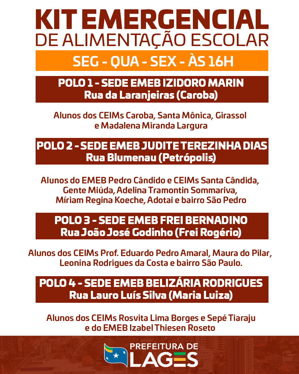 Em virtude do feriado de Sexta-Feira Santa, no dia 10 de abril, a Prefeitura irá fazer a distribuição do kit emergencial da alimentação escolar (sopa pronta para o consumo, pão e hortifrúti), nesta primeira semana da ação, neste sábado, dia 11 de abril, às 16 horas. “Nos próximos dias os estudantes matriculados nas unidades escolares do Campo também receberão os kits com itens da merenda escolar com o devido balanceamento nutricional”, salienta o prefeito Ceron.