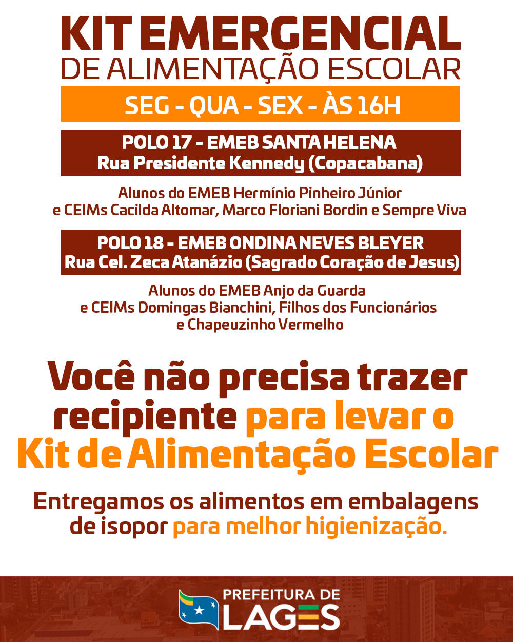 A Prefeitura de Lages, por determinação do prefeito Antonio Ceron, e por meio da Secretaria Municipal da Educação, em consonância com as orientações emitidas pela Federação Catarinense dos Municípios (Fecam) iniciará nesta quarta-feira (8 de abril) a partir das 16 horas, a distribuição do kit emergencial da alimentação escolar (sopa pronta para o consumo, pão e hortifrúti). Esta ação beneficiará a comunidade escolar do Sistema Municipal da Educação nas segundas, quartas e sextas-feiras, sempre às 16 horas. São exatamente 16.388 alunos matriculados no ano letivo de 2020. As aulas no município estão suspensas devido à pandemia do novo Coronavírus (Covid-19).