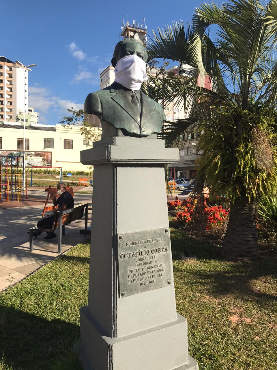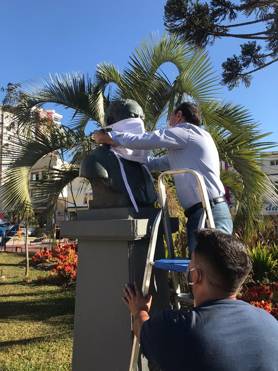 A partir da próxima segunda-feira (20 de abril) o uso de máscaras será obrigatório para acessar e permanecer em prédios, espaços públicos e privados em Lages. Pensando nisso, a Prefeitura, através da Diretoria de Inclusão e Cidadania, colocou na tarde desta sexta-feira (17) máscaras de pano em monumentos de algumas figuras importantes da cidade: Nereu Ramos e Octacílio Costa (no Calçadão), e Antônio Correia Pinto de Macedo (na Praça da Bandeira - Av. Duque de Caxias).