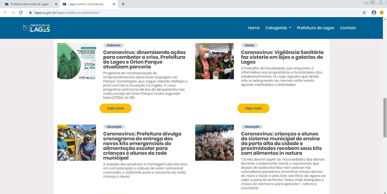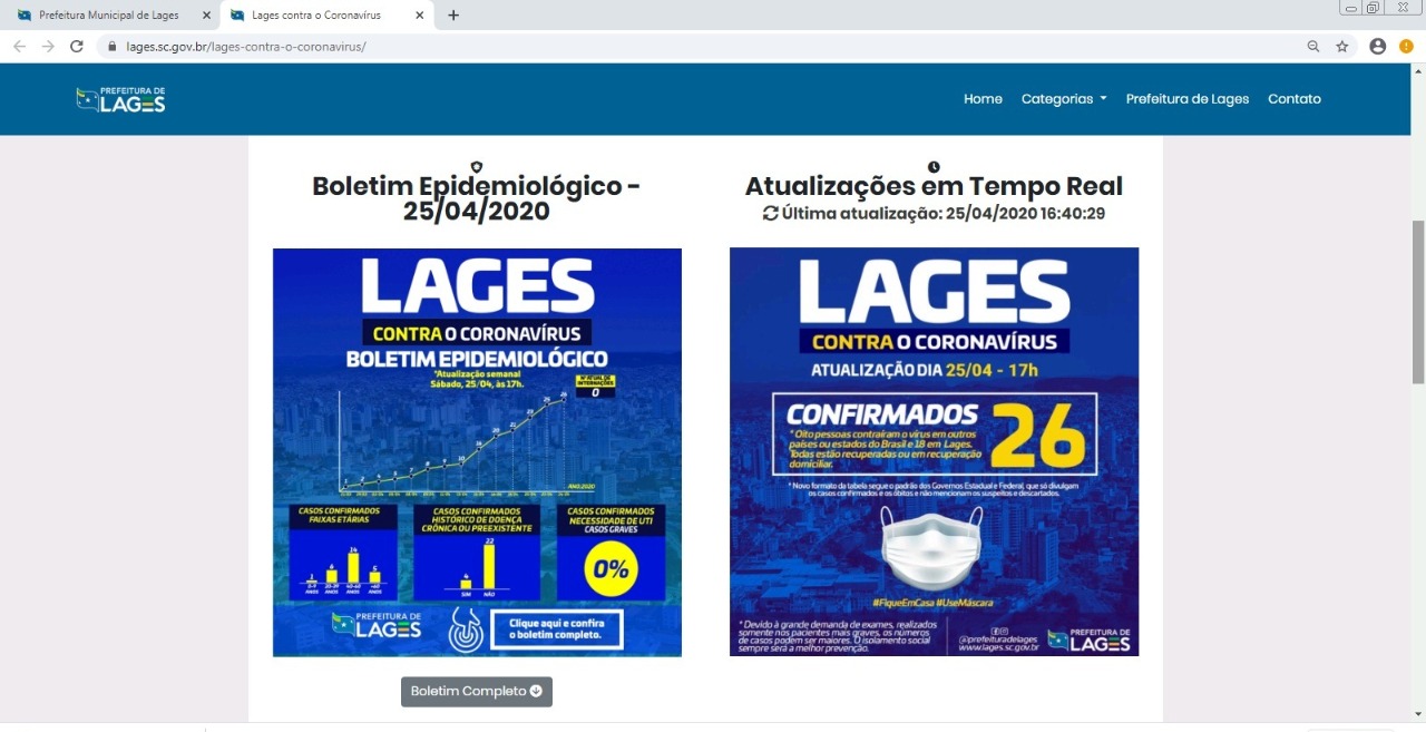 A página, desenvolvida pelas secretarias de Comunicação Social e Saúde, dá acesso às redes sociais, apresenta notícias, campanhas de orientação, boletim epidemiológico semanal e tabela de casos em tempo real. O portal pode ser acessado facilmente por qualquer pessoa, a qualquer hora do dia, pelo site oficial do Município: www.lages.sc.gov.br.