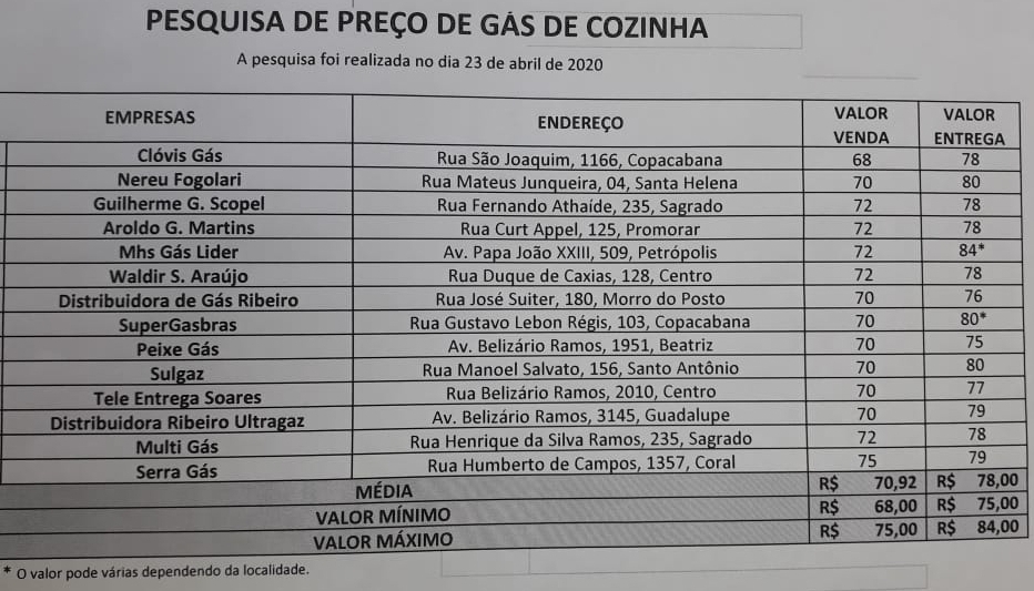 Indispensável no preparo de alimentos em residências, condomínios e estabelecimentos industriais e comerciais, o preço do botijão tipo P13, de 13 quilos, para armazenamento do Gás Liquefeito de Petróleo (GLP), foi alvo de análise e comparação em Lages, a partir de valores pesquisados pelo Programa de Defesa do Consumidor (Procon), durante uma operação na quinta-feira (23 de abril). Foram averiguados os valores de venda e de comercialização com entrega, praticados por 14 empresas distribuidoras de gás em Lages, situadas nos bairros Copacabana, Santa Helena, Sagrado Coração de Jesus, Promorar, Petrópolis, Centro, Morro do Posto, Beatriz, Santo Antônio, Guadalupe e Coral.