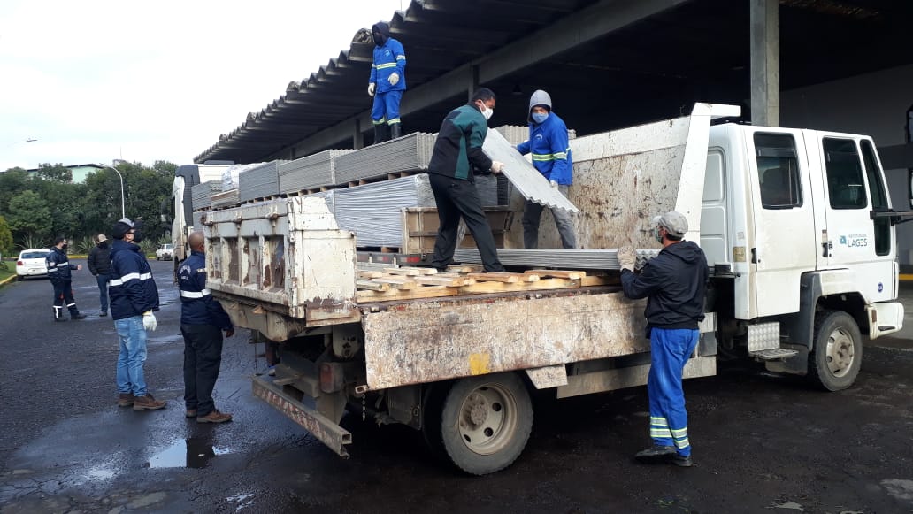 O prefeito Antonio Ceron e o secretário executivo da Defesa Civil de Lages, Luiz Henrique de Souza, receberam na manhã desta quinta-feira (9 de julho), a segunda remessa de telhas fornecidas pelo Governo do Estado, através da Defesa Civil Estadual. Ao todo, nesta segunda remessa, chegaram 4.100 telhas de fibrocimento de 4 milímetros de espessura, mais 66 folhas de telhas de 5 milímetros, 1.024 cumeeiras (telhões) inferiores e superiores (4 milímetros) e 2.590 parafusos.