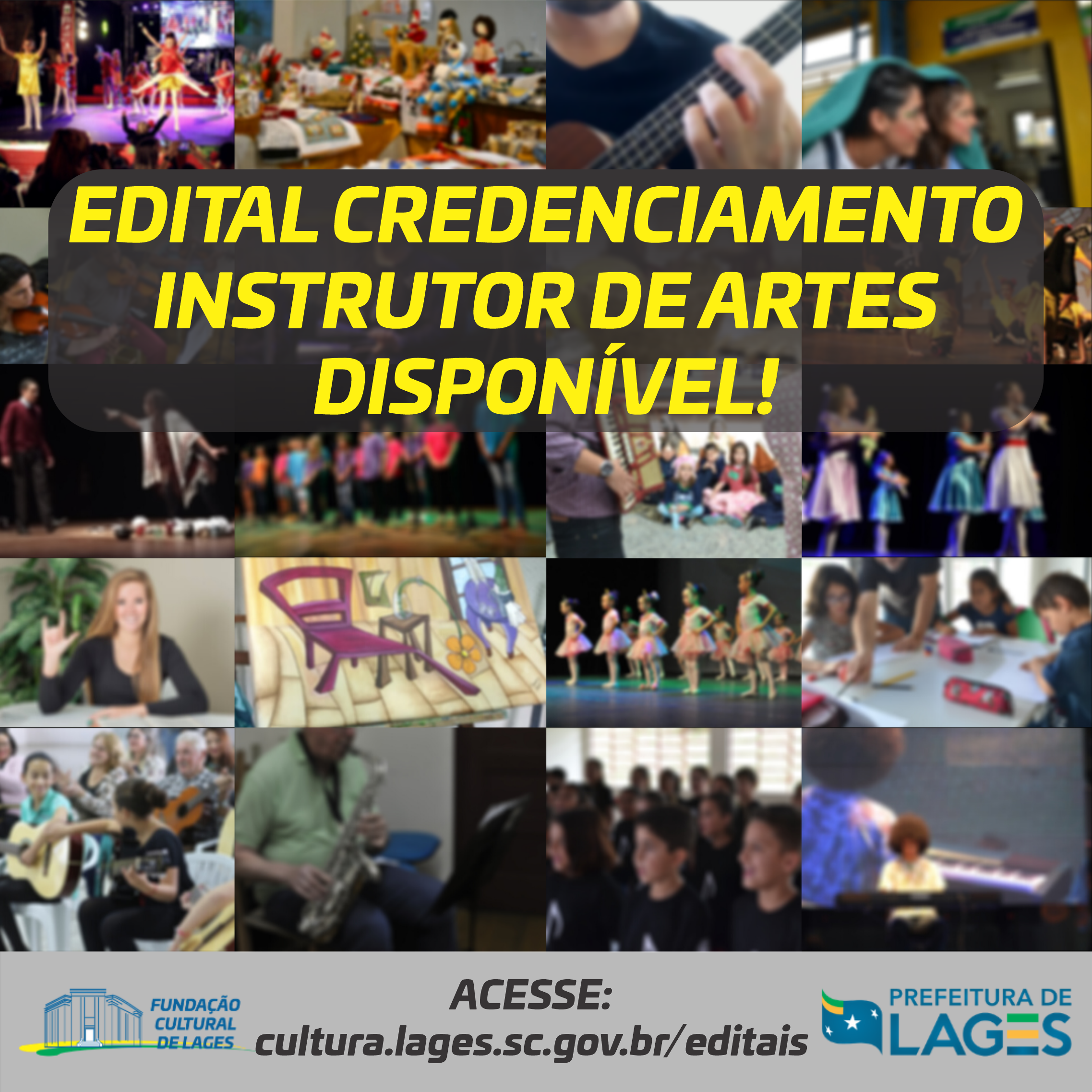A Prefeitura de Lages, através da Fundação Cultural (FCL), disponibilizou, nesta terça-feira (26 de janeiro), o Edital de Credenciamento para Instrutor de Artes em Geral (001/2021). O edital e seus anexos podem ser localizados nos sites da Prefeitura de Lages - https://www.lages.sc.gov.br/editais-e-chamamentos e da Fundação Cultural - no endereço https://cultura.lages.sc.gov.br/editais (não é necessário acrescentar www).
