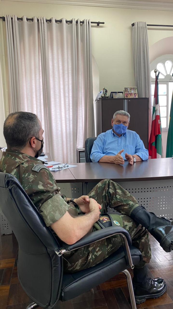 O prefeito Antonio Ceron recebeu em seu gabinete, na tarde desta quarta-feira (27 de janeiro), o tenente-coronel Anderson Soares do Carmo, comandante do 1° Batalhão Ferroviário de Lages. Durante a reunião conversaram sobre diversos assuntos, entre eles o enfrentamento e prevenção à Covid-19 no Município.