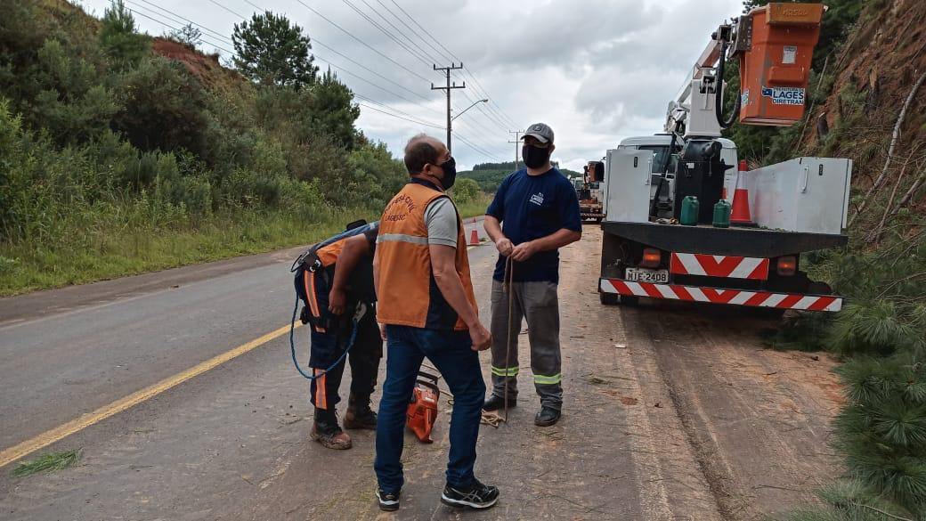 Exemplares de árvores de pinus, localizadas à beira da avenida Santa Catarina, no Acesso Sul, via de grande fluxo de movimento em direção à rodovia BR-116, assim como de chegada a Lages, estavam inclinadas e ofereciam risco de cair sobre a pista de rolamento de travessia de veículos, perigo iminente também em consequência das contínuas e intensas chuvas que atingem Lages há pelo menos duas semanas com curtos e médios espaços de tempo de intervalo entre uma pancada e outra.