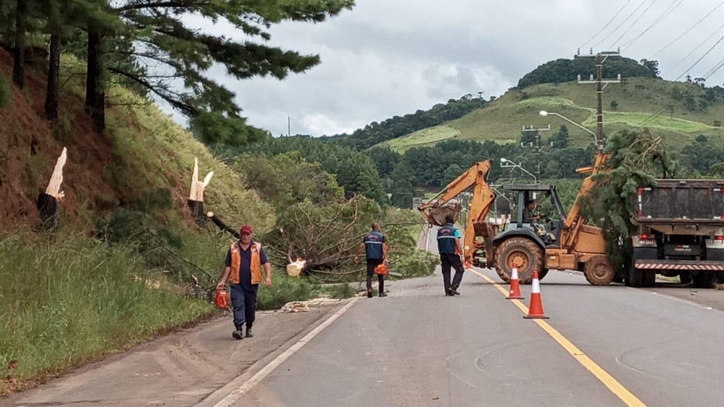 Defesa Civil atua de forma preventiva e retira árvores de pinus inclinadas à margem da avenida Santa Catarina, acesso à BR-116