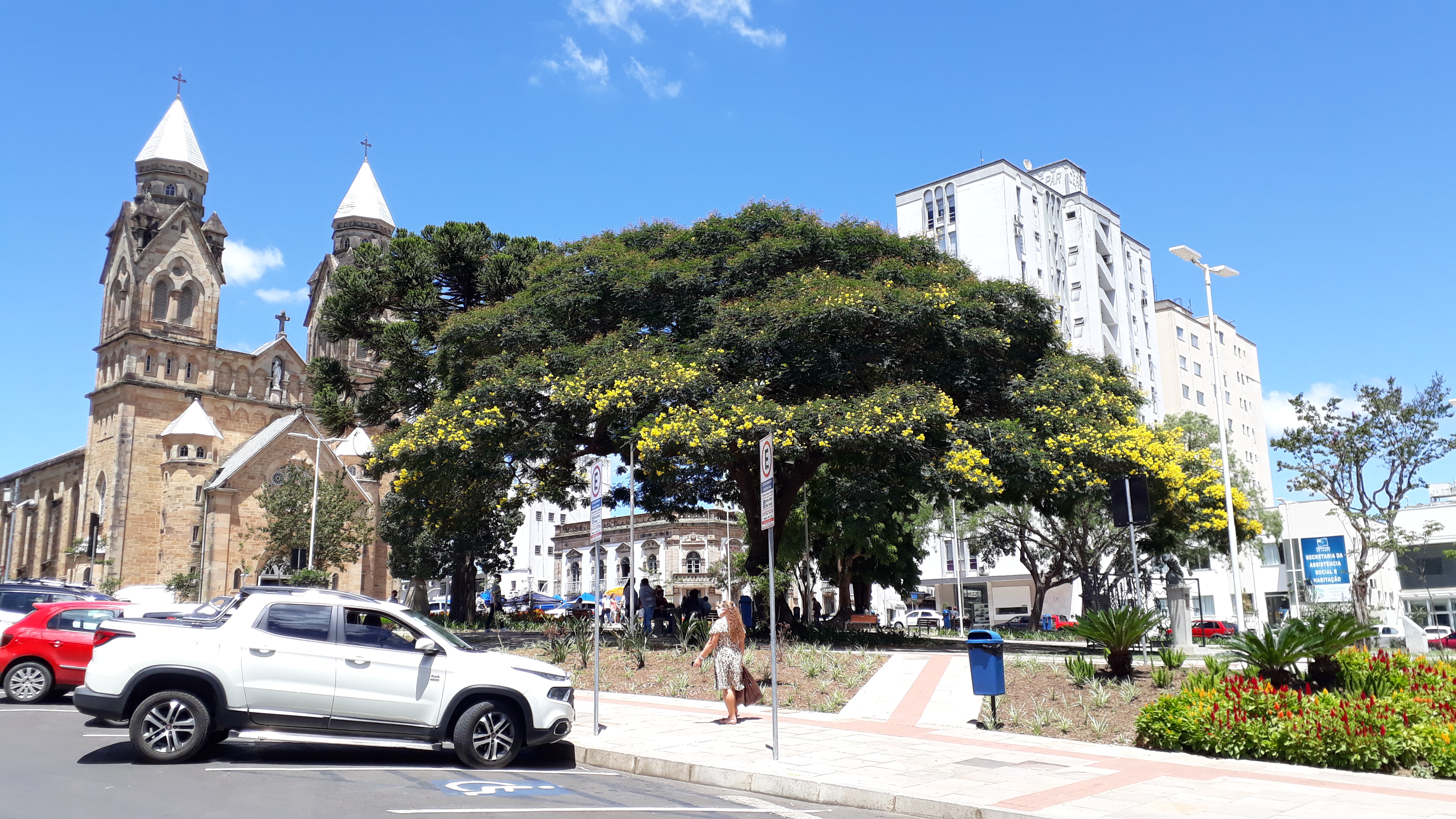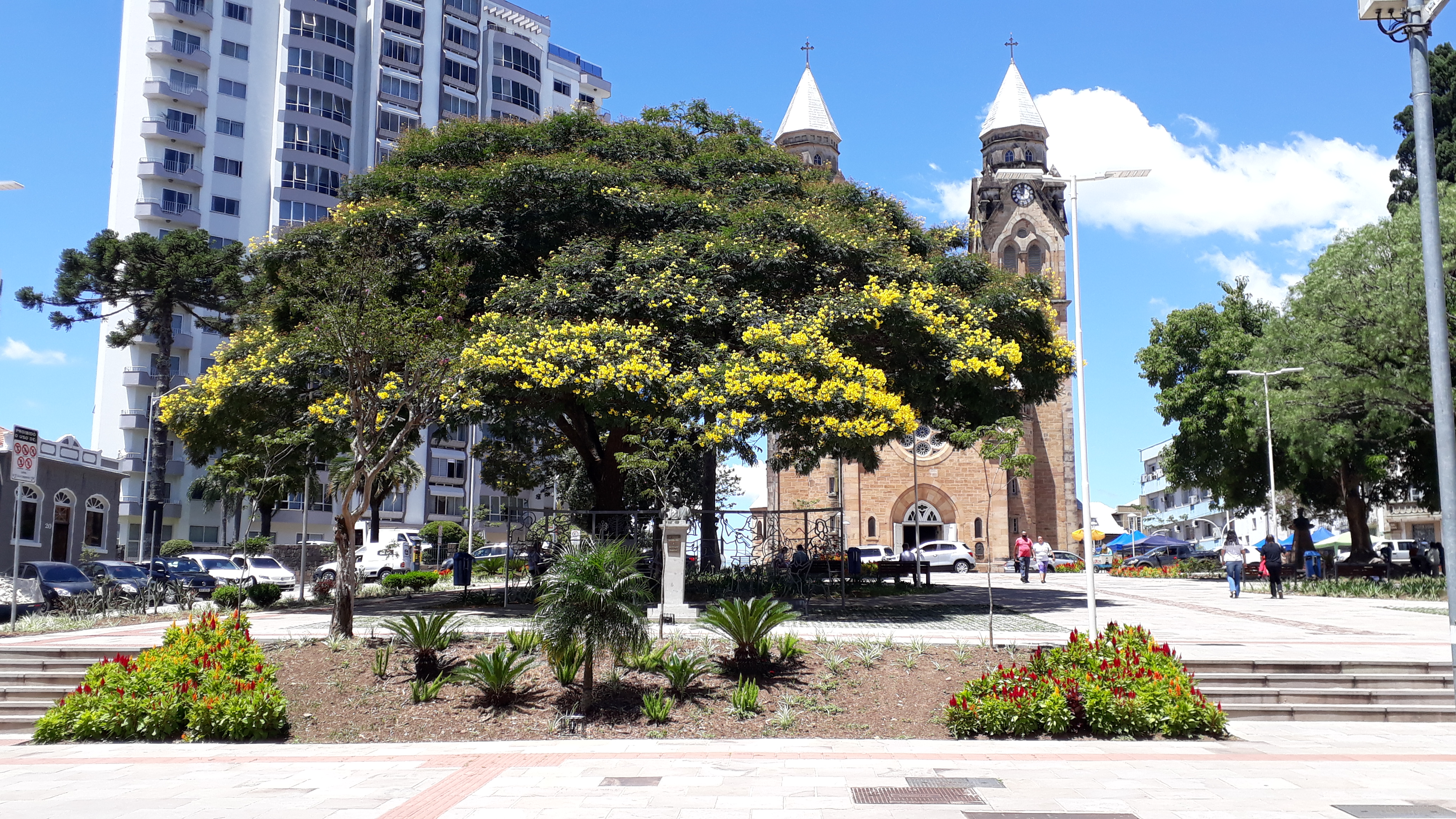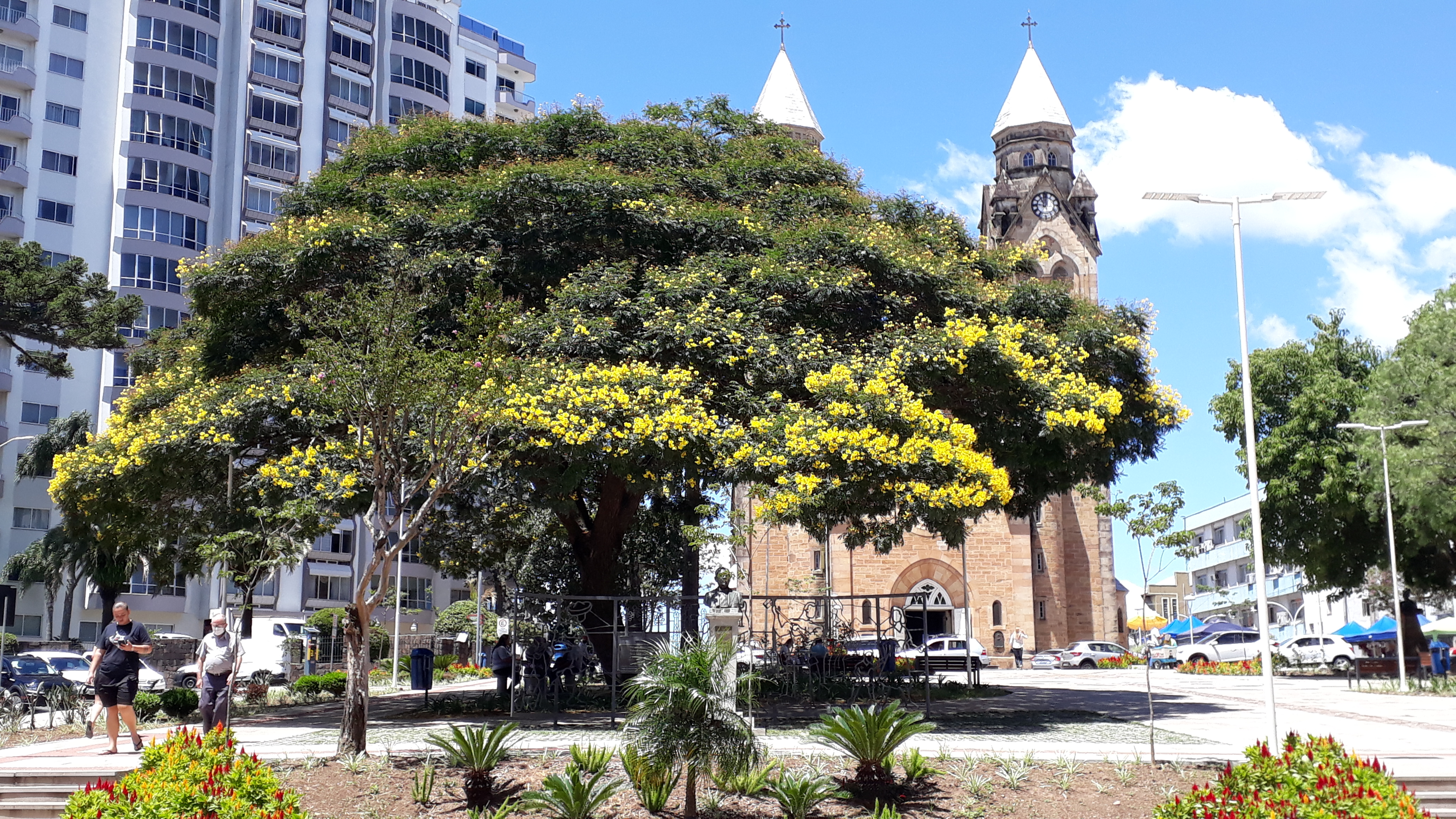 A árvore gigantesca na Praça João Ribeiro, com suas flores minúsculas e cortesas, em amarelo, não passa despercebida e constitui um enorme círculo de sombra para quem procura recarregar as energias em seus bancos próximos ou para aconchegar as crianças que brincam faceiras por ali, correndo atrás dos pássaros e se divertindo sem pressa. Esta é a canafístula (Peltophorum dubium) ou angico amarelo, uma espécie caducifólia, rústica e de crescimento rápido, e apresenta tolerância e resistência ao clima frio. Com florescimento decorativo, é intensamente utilizada na arborização urbana na América do Sul.
