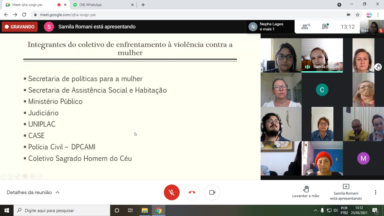 O Projeto Estruturação da Rede de Prevenção e Enfrentamento às Violências contra a Mulher no Município de Lages foi apresentado, de forma online, à rede intersetorial de atendimento, pela Secretaria de Políticas para a Mulher, em parceria com o Coletivo de Enfrentamento à Violência contra a Mulher, nesta quinta-feira (25 de março). A reunião contou com representantes das secretarias municipais da Assistência Social e Habitação, Saúde, Educação e de Políticas para a Mulher, Ministério Público (MP), Poder Judiciário e Casa de Semiliberdade.