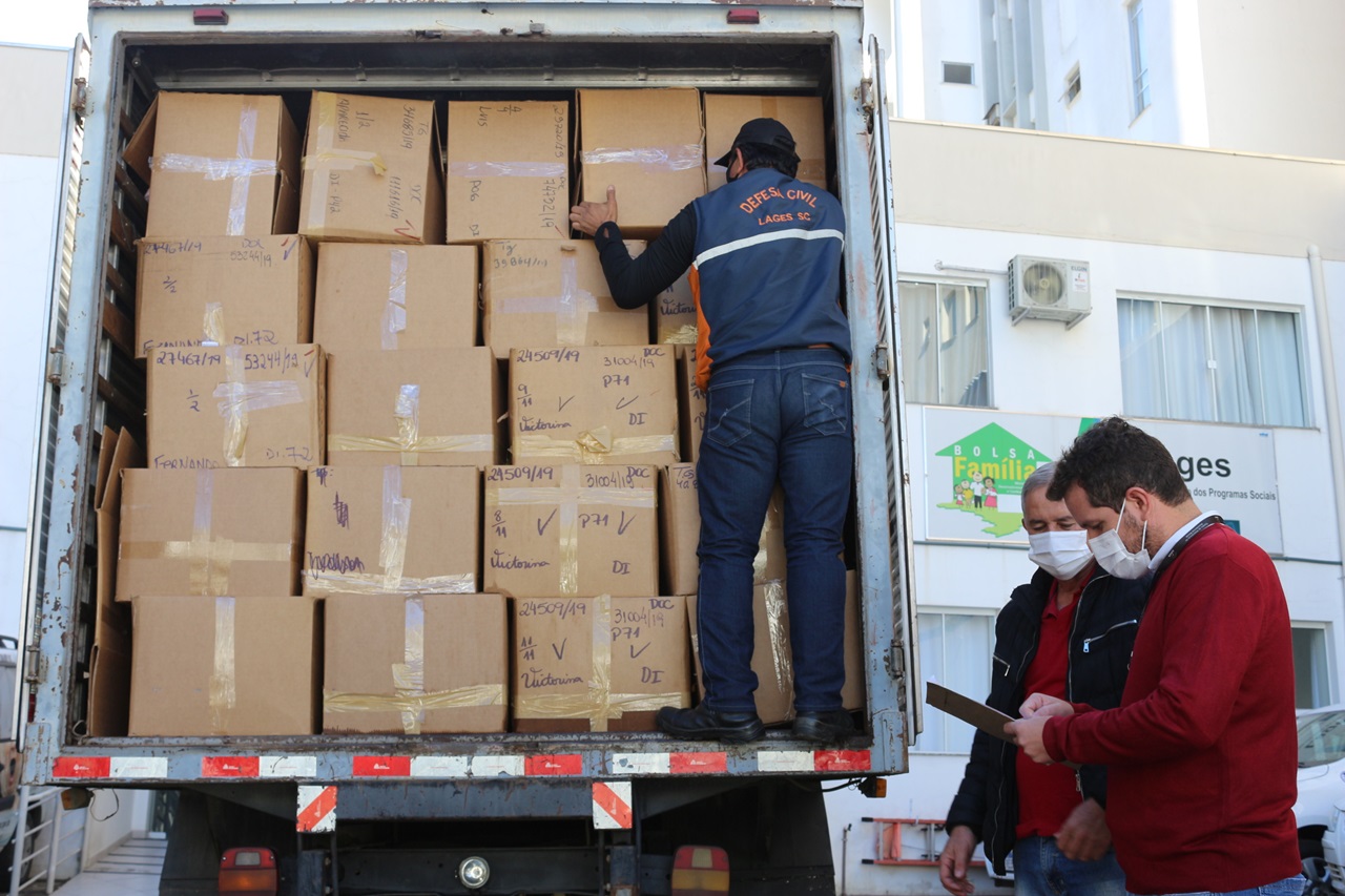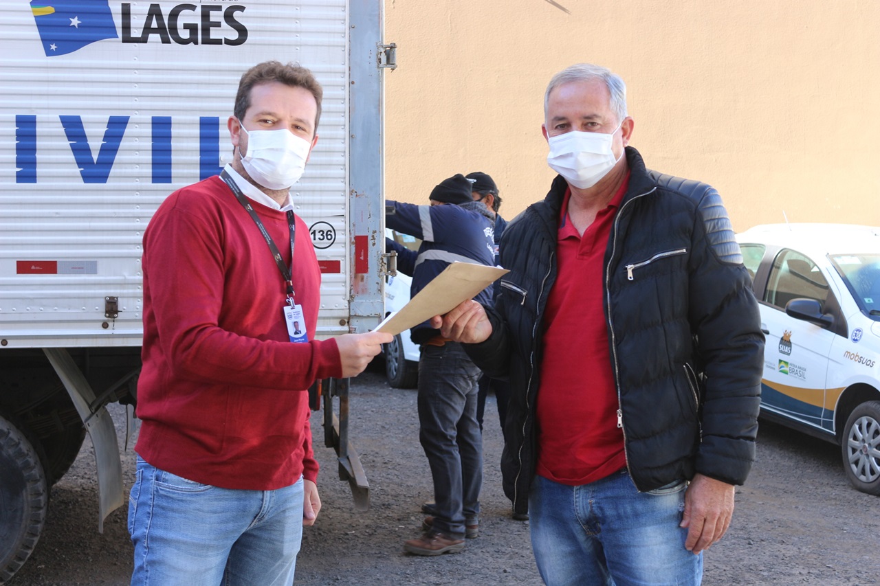 O transporte da carga, que chegou lacrada, foi feita pela Defesa Civil de Lages, e a entrega do material foi feita diretamente pelo secretário Executivo da Defesa Civil, João Eduardo Pacheco, ao secretário da Assistência Social e Habitação, Jean Pierre Ezequiel.