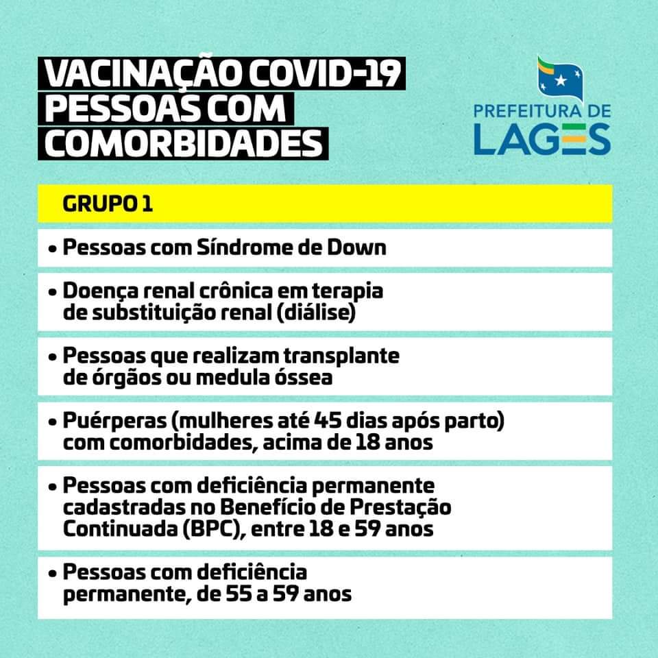 Pessoas com comorbidades podem realizar o pré-cadastro no site da Prefeitura de Lages (www.lages.sc.gov.br), onde estão elencadas todas as comorbidades que podem ser vacinadas. O pré-cadastro serve para se ter uma estimativa de pessoas a serem vacinadas neste grupo, garantindo assim, uma melhor logística de distribuição das doses. Além disso, preenchendo o pré-cadastro, as pessoas podem saber se tem as comorbidades que estão aptas a serem vacinadas, nesta fase.