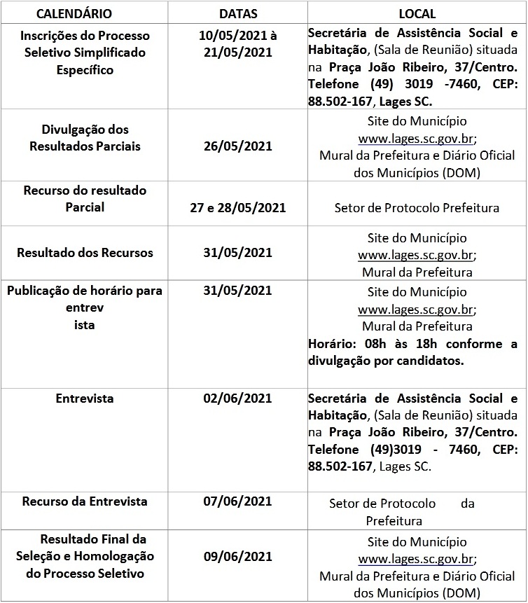 Desde o dia 10 deste mês está aberto o período de inscrições gratuitas para o Processo Seletivo Público Simplificado Específico nº: 002/2021 SMASH/PML (Secretaria Municipal da Assistência Social e Habitação/Prefeitura do Município de Lages), inerente à contratação temporária de profissional assistente social, psicólogo e educador social para a Secretaria da Assistência Social e Habitação, tornado público também por intermédio da Secretaria da Administração e Fazenda. O preenchimento das vagas temporárias para o quadro de pessoal terá como base a análise de títulos/currículos/tempo de serviço na área e entrevista, para admissão por tempo determinado, ou seja, até 31 de dezembro de 2021, com a finalidade de atuação dos trabalhadores na execução do projeto de Desacolhimento de Adolescentes em Instituições de Acolhimento (em transição para a vida em sociedade quando atingirem a maioridade - 18 anos), com recursos financeiros do Fundo da Infância e Adolescência (FIA). O contrato não será prorrogado. O certame será executado por uma Comissão Especial do Processo Público Simplificado Específico.