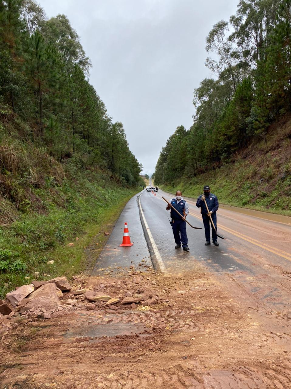 Um deslizamento de blocos rochosos na pista estava impedindo a trafegabilidade da via e colocando em risco todos aqueles que transitavam pela região. Parte da rodovia foi interditada temporariamente enquanto a retirada do material estava sendo efetuada sob a orientação do Secretário Executivo de Proteção e Defesa Civil, João Eduardo da Silva Pacheco (Sargento Pacheco).