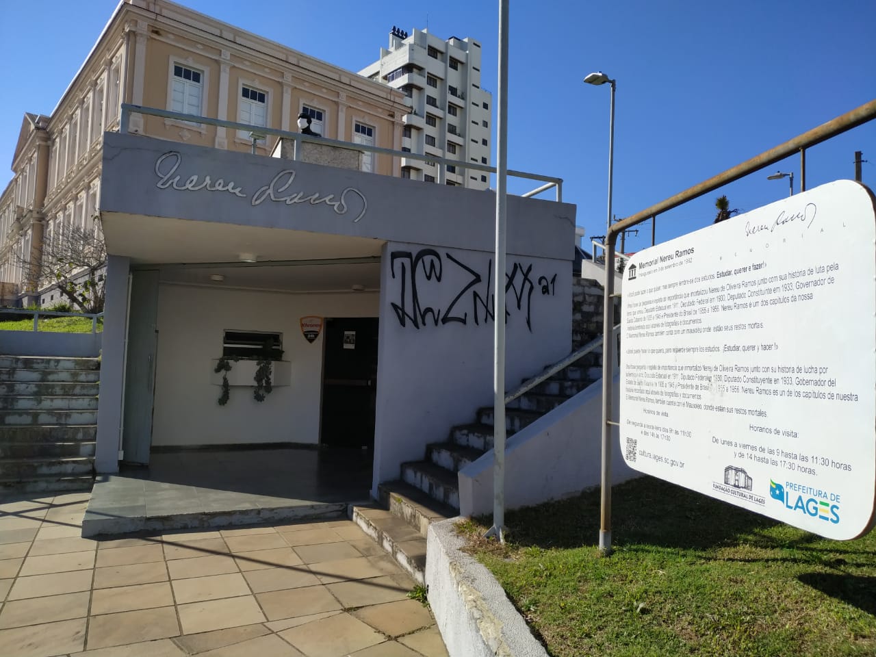 O Memorial Nereu Ramos, construído para guardar restos mortais, fotografias e inúmeros objetos e roupas de uso pessoal do ex-Presidente da República do Brasil, amanheceu com parede pichada, um ato de vandalismo em desrespeito ao patrimônio público.