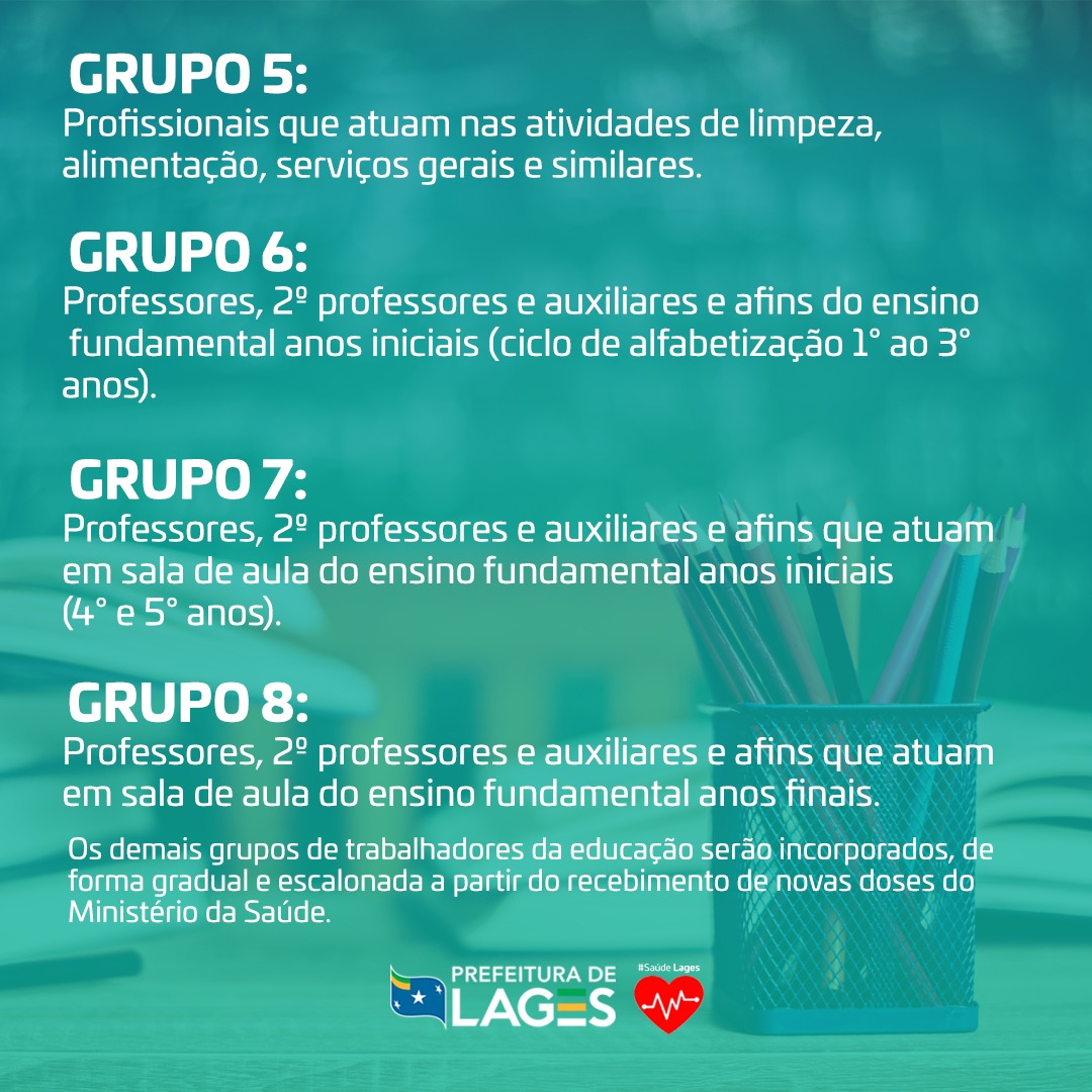 Na última quinta-feira (27), o município de Lages recebeu mais 6.585 doses, assim, sendo possível estender a vacinação para mais grupos dos profissionais da educação nesta Sexta-Feira (foi aberta vacinação para os grupos 3 e 4 da educação) e todos os órgãos de segurança pública.