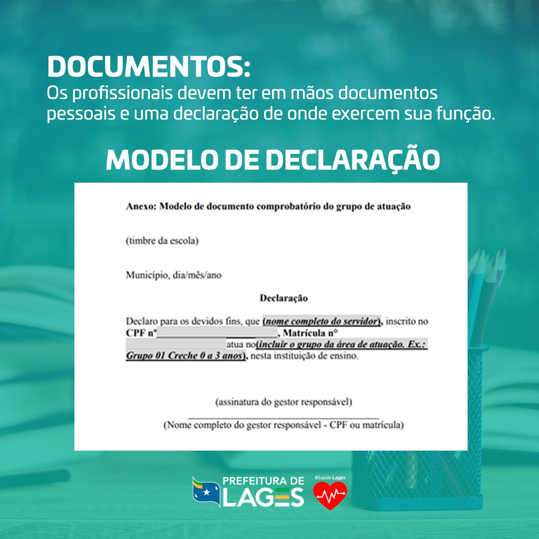 Documentos: Os profissionais da educação devem ter em mãos documentos pessoais e uma declaração de onde exercem sua função. Já os profissionais de segurança devem comprovar seu vínculo com as corporações, mediante apresentação de documento com foto, CPF ou Cartão SUS, carteira funcional, contracheque ou documento comprobatório (ofício) assinado pela chefia da corporação, informando que o profissional tem vínculo efetivo e ativo com a instituição