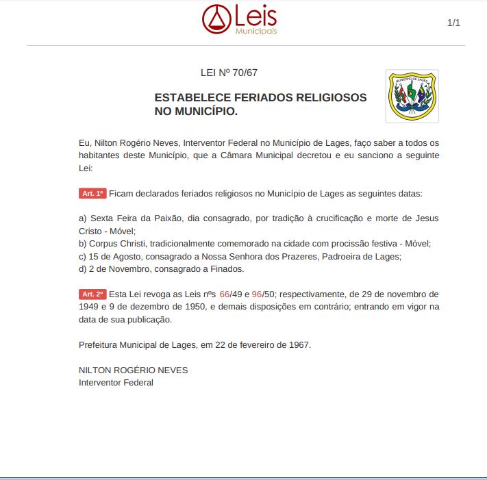 LEI Nº 70/67 ESTABELECE FERIADOS RELIGIOSOS NO MUNICÍPIO.