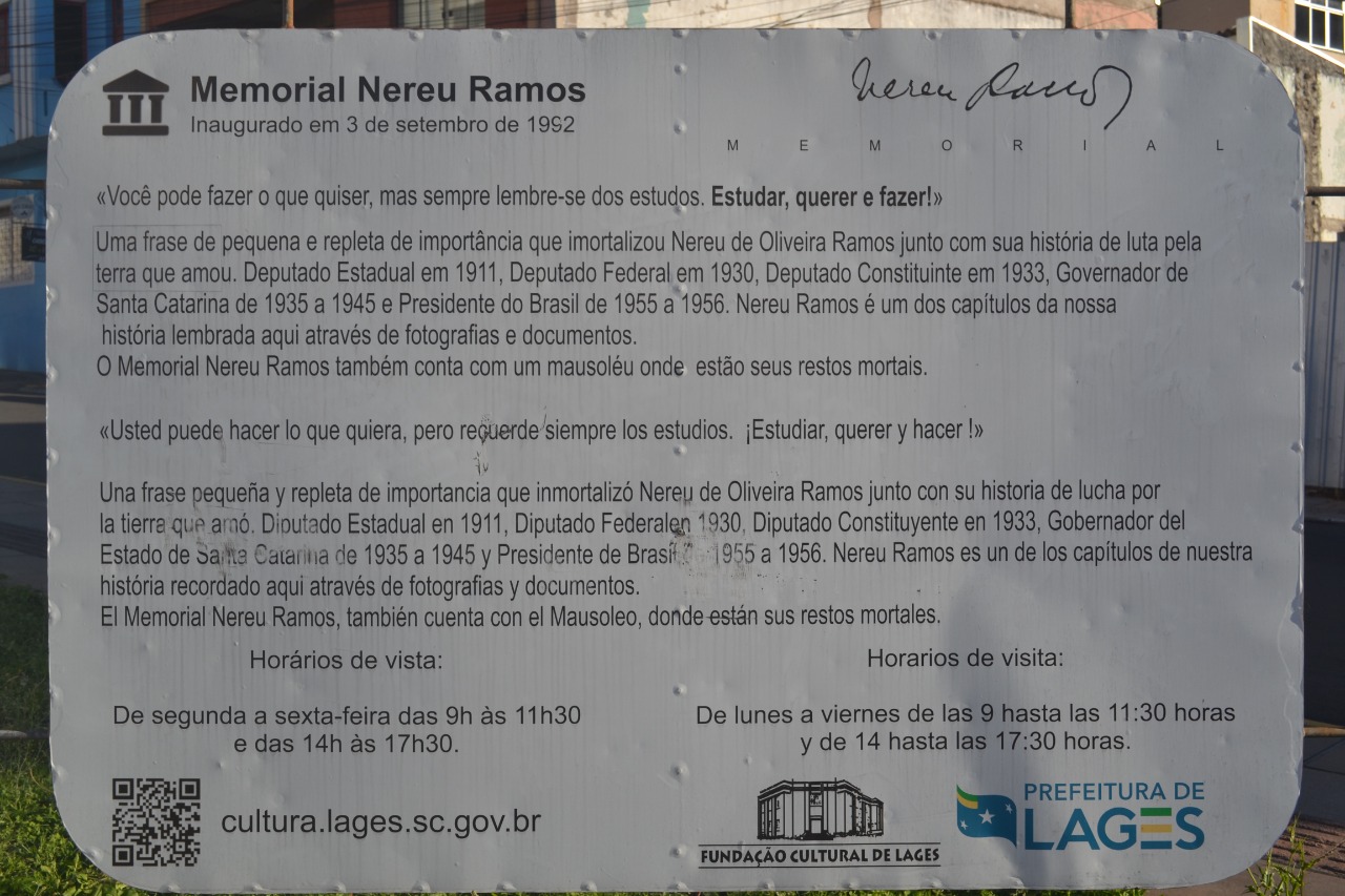 O Memorial Nereu Ramos está aberto de segunda a sexta das 9h às 11h30 e das 14h às 17h30. Para consultas de protocolos para visitação e agendamento de grupos o telefone disponibilizado é o (49) 3019-7498.