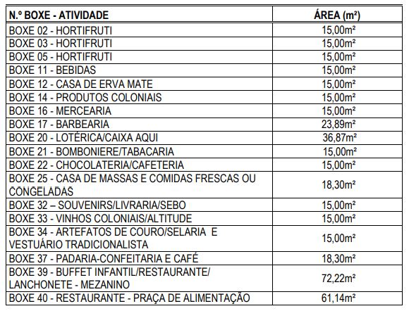E neste período a Administração Municipal está empenhada na licitação dos últimos 18 boxes de um total de 40, para comercialização de produtos essencialmente regionais, desde a gastronomia até o artesanato e outras conveniências como praça de alimentação, floricultura, casa de mate, choperia, tabacaria e empório de produtos naturais.
