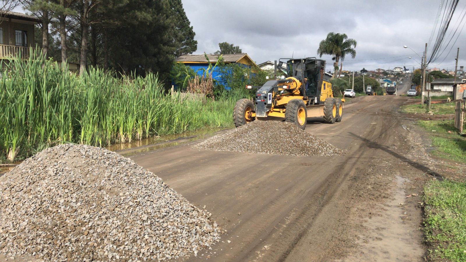 Foram realizados patrolamento, colocação de brita ou cascalho e a compactação com o rolo compressor