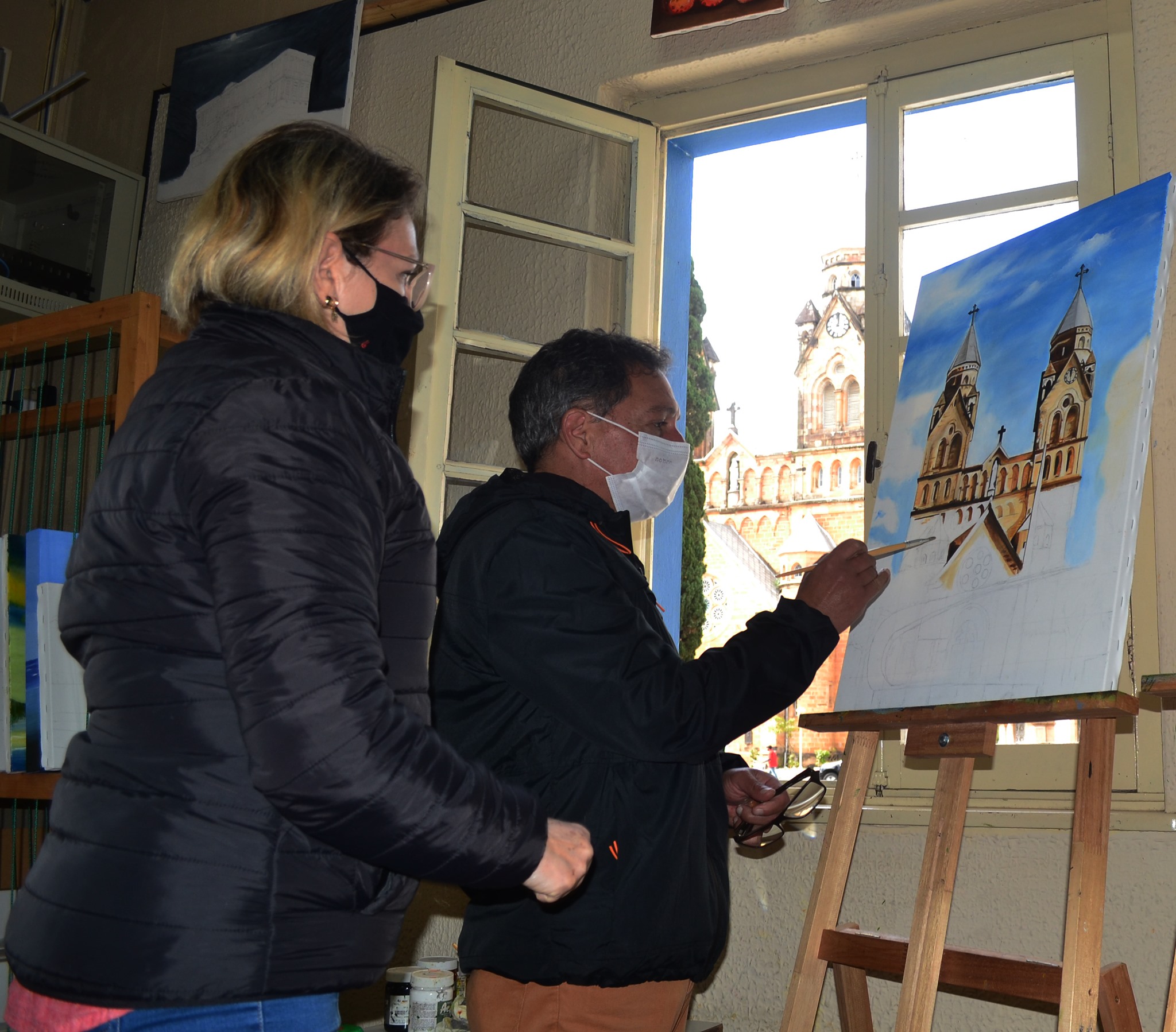 Rosa Werner é outra instrutora de Pintura em Tela da Escola de Artes. Um dos seus muitos alunos é Mauro Aurélio Chaves. No momento Rosa orienta Mauro em uma reprodução da Catedral Diocesana de Lages. Para a instrutora, cada inspiração vale e resulta em uma grande obra. “No caso do Mauro, da janela da Escola de Artes ele observa a Catedral ao vivo e a cores, não precisa de outra inspiração, certo?”, diz.