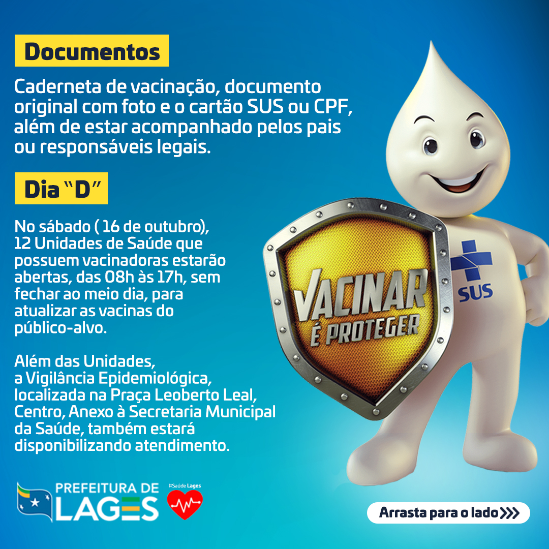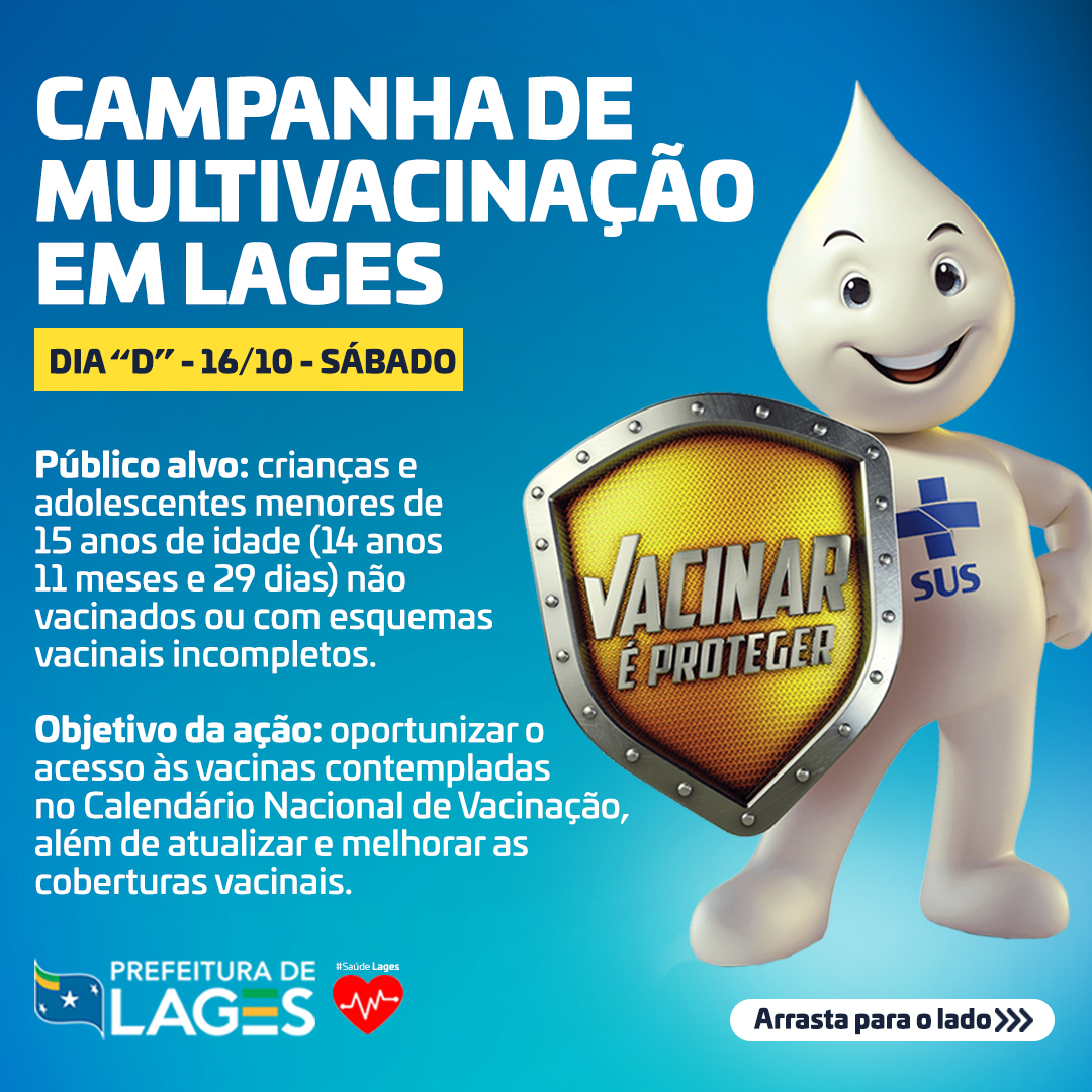 A Prefeitura de Lages, por meio da Secretaria da Saúde, com base no Programa Nacional de Imunizações (PNI), realiza e adere no período de 01 a 29 de outubro de 2021, à Campanha Nacional de Multivacinação para Atualização da Caderneta de Vacinação das crianças e adolescentes menores de 15 anos de idade.