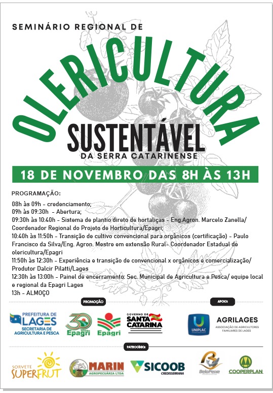 A Prefeitura de Lages, por meio da Secretaria da Agricultura e Pesca, em parceria com a Empresa de Pesquisa Agropecuária e Extensão Rural de Santa Catarina (Epagri) e Secretaria de Estado da Agricultura, da Pesca e Desenvolvimento Rural, promovem nesta quinta-feira (18 de novembro), das 8h às 13h, na Universidade do Planalto Catarinense (Uniplac), o Seminário Regional de Olericultura Sustentável da Serra Catarinense.