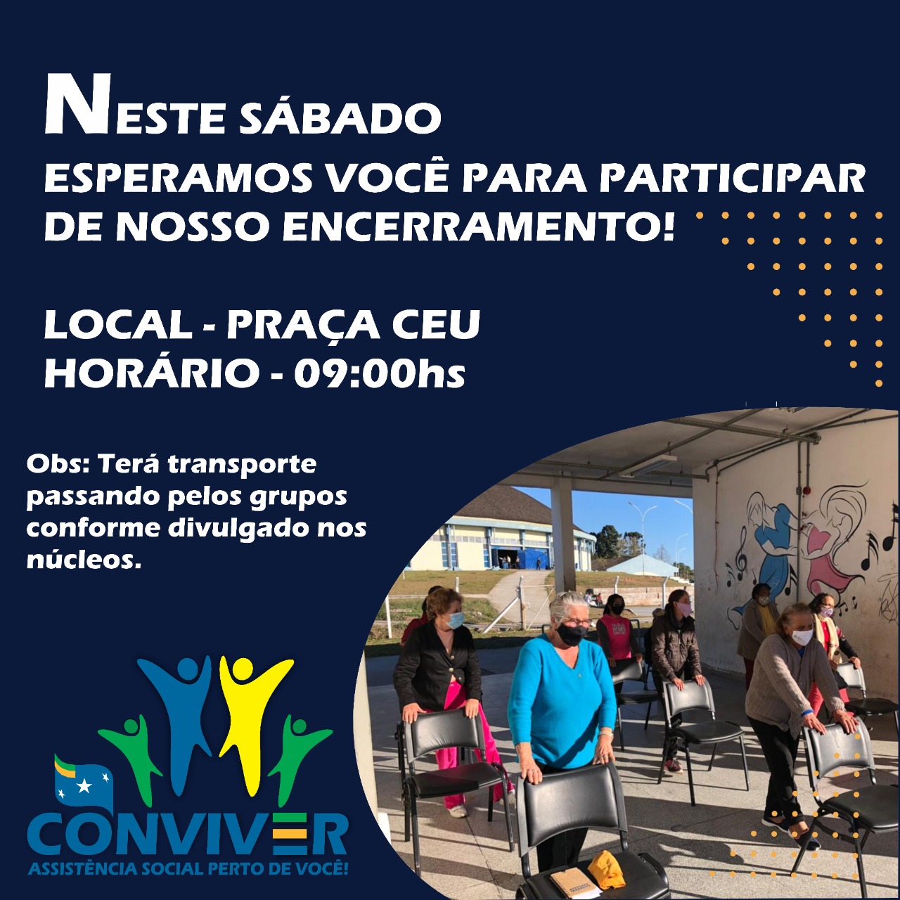Está programado para este sábado (11 de dezembro), a partir das 9 horas, na praça do CEU (Estação Cidadania) – localizada ao lado do Ginásio Jones Minosso, no bairro Universitário – o encerramento das atividades do ano, do programa Conviver, executado pela Secretaria de Assistência Social e Habitação, da Prefeitura de Lages. São esperados cerca de 250 idosos que serão recepcionados por músicas tradicionalistas e após, irão realizar um aulão de ginástica para seguir em uma caminhada no entorno do Ginásio Jones Minosso, finalizando com uma recepção de frutas, suco e sanduiche natural.