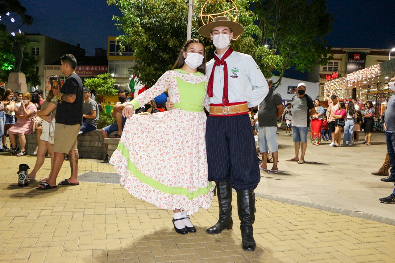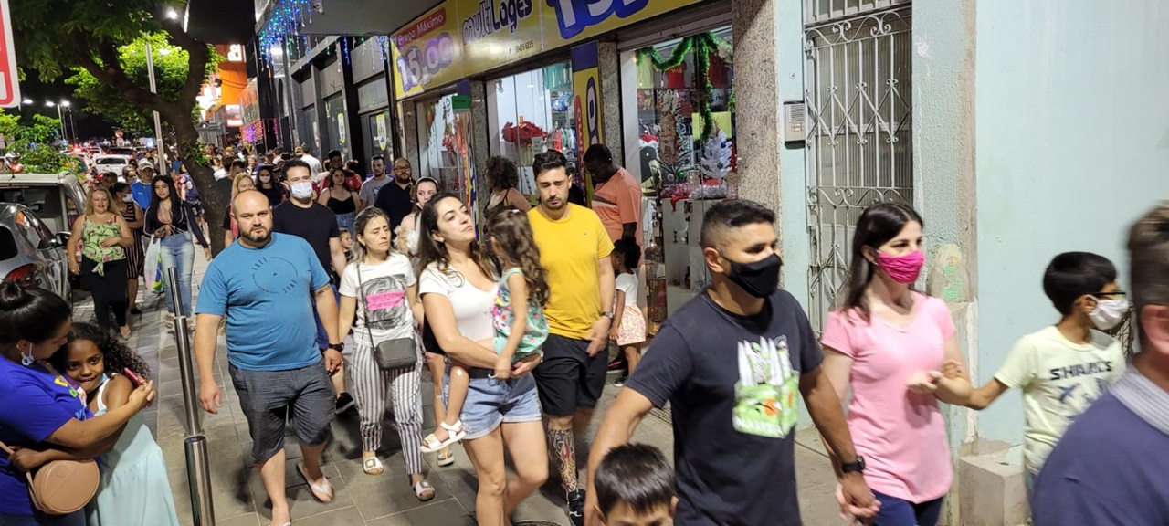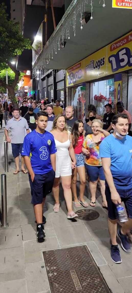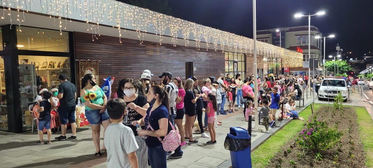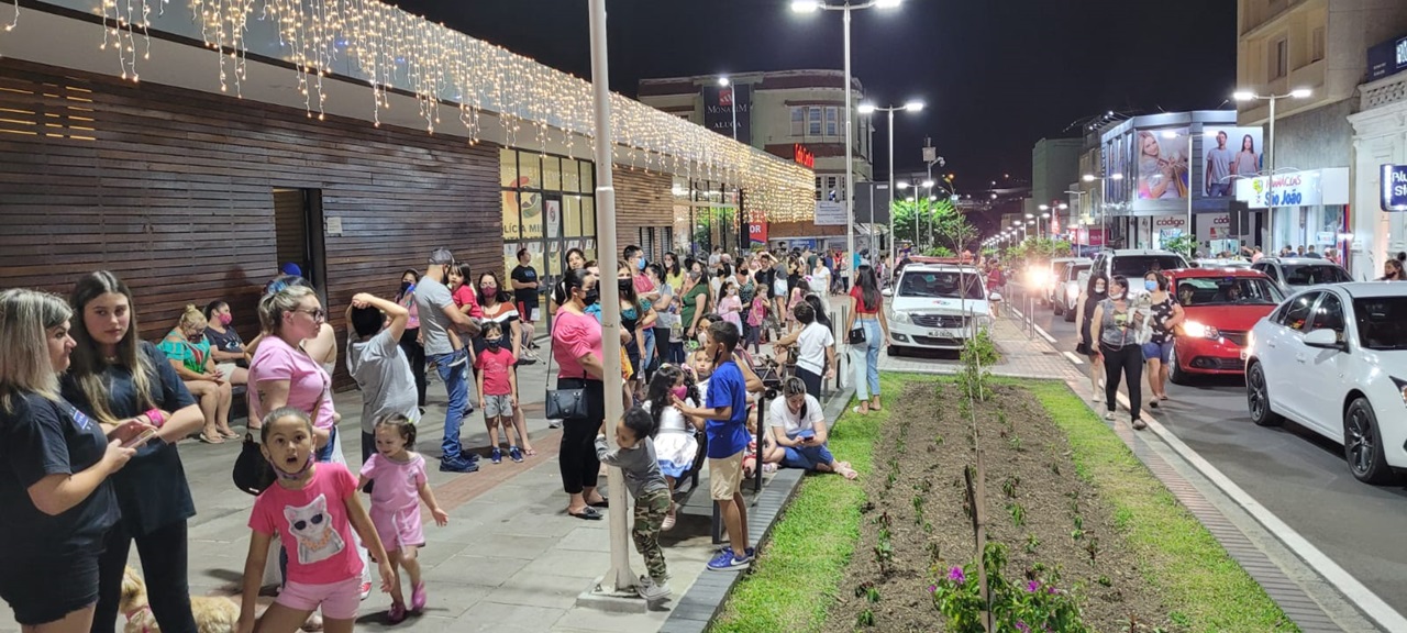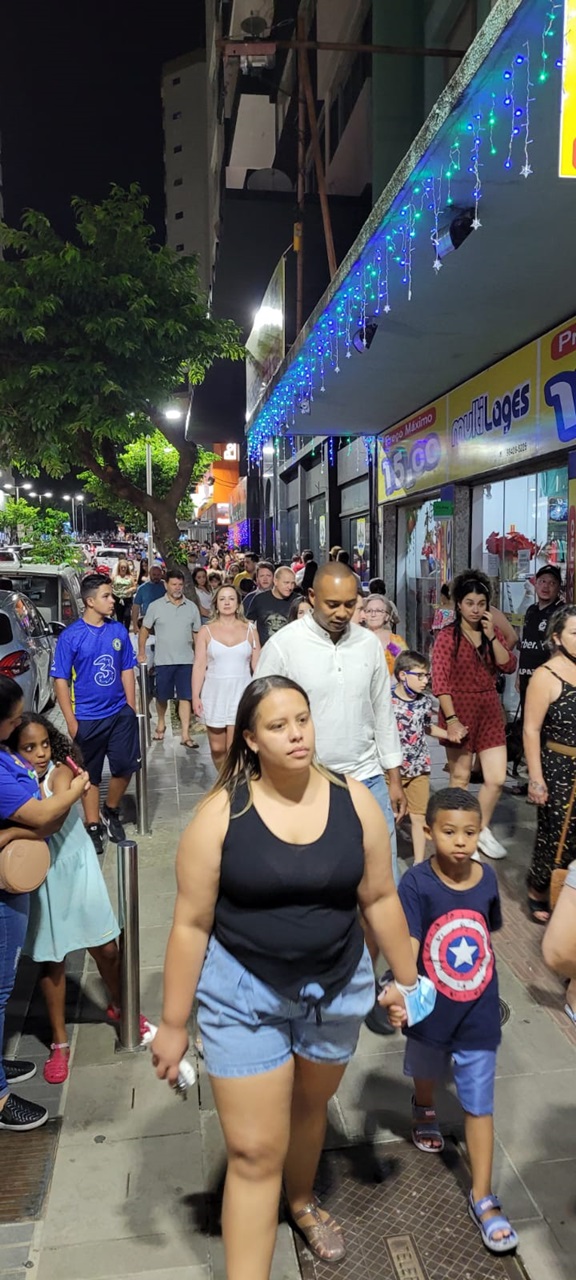 Uma multidão andava pelas calçadas do Centro de Lages na noite deste domingo (12 de dezembro). Famílias passeavam com seus cachorrinhos de estimação e conferiam as vitrines, pois as lojas abriram das 14h às 20h e estarão com horário distinto até o dia 23, antevéspera de Natal, igualmente ao shopping e aos supermercados, estes até fim do ano. Crianças avistavam as peças coloridas e davam risada com seus balões nas mãos e sua pipoca salgada e doce, milho verde, churros, algodão doce e pasteis; longa fila para embarque no Bondinho do Papai e Mamãe Noel; casais posavam para selfies com suas cuias de chimarrão, e grupos de amigos dançavam e cantavam.