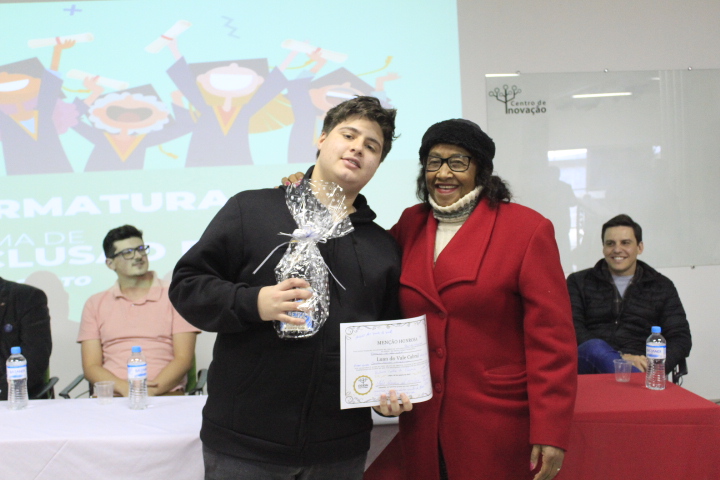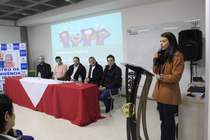 E a tarde desta terça-feira (6 de agosto) foi dia de comemorar e levantar o diploma de conclusão do curso de inclusão digital gratuito oferecido pelo Orion e Instituto Orion, por parte de pessoas da melhor idade participantes das atividades do Centro de Convivência do Idoso (CCI) Dom João Oneres Marchiori, situado no bairro Várzea, coordenado pela Secretaria da Assistência Social e Habitação. Esta foi a primeira turma de inclusão digital do CCI. Os idosos são levados ao Centro de Inovação por veículo da Secretaria da Assistência Social.