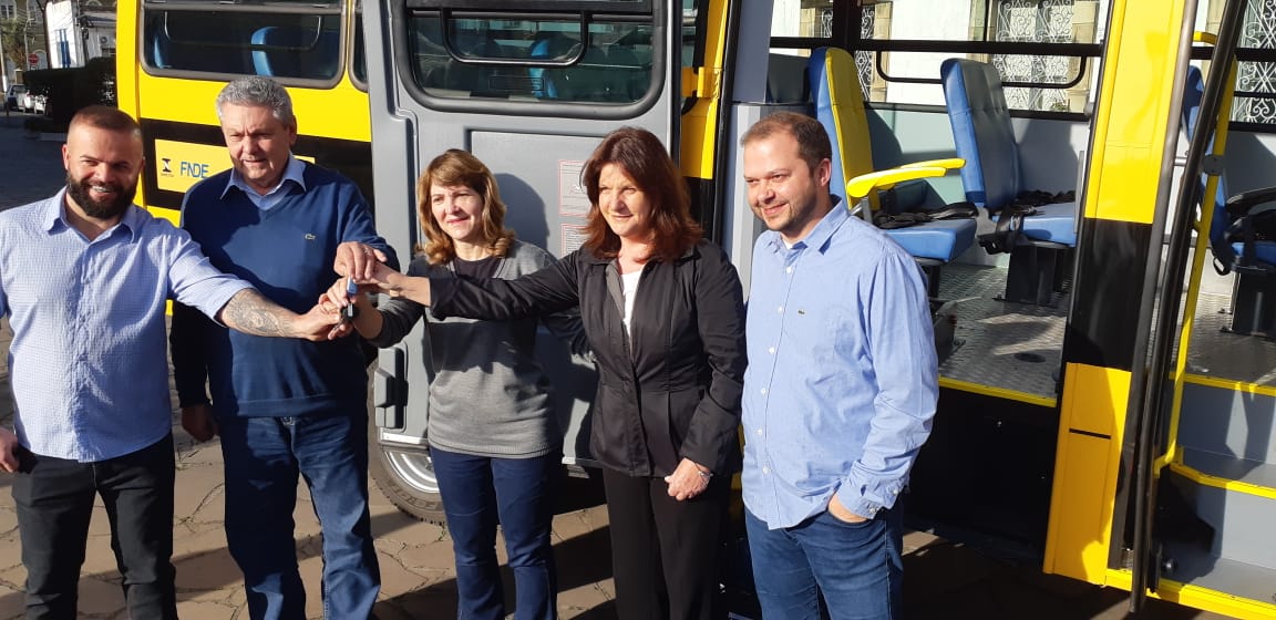 O prefeito Antonio Ceron, o vice Juliano Polese e a secretária municipal da Educação, Ivana Michaltchuk, receberam da deputada federal Carmen Zanotto, a chave do novo micro-ônibus que irá atuar no transporte dos alunos da rede municipal de ensino. O ato foi realizado na manhã desta sexta-feira (9 de agosto), no largo da Catedral Diocesana.