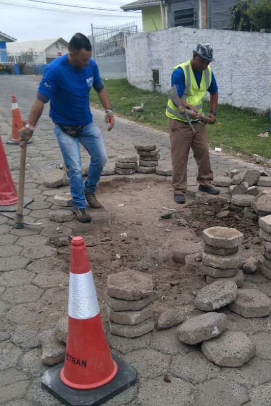 Na rua Celio da Silva Cardoso, no bairro Vila Nova, a equipe de trabalho de recuperação atua na correção da pavimentação em lajotas dessa via.