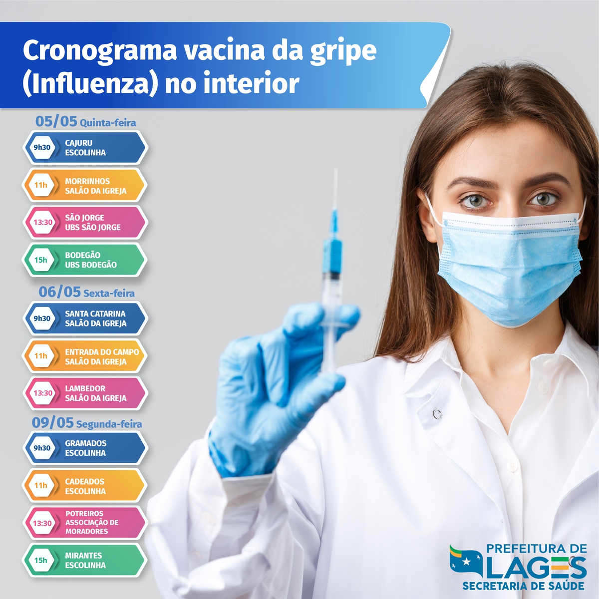 A Prefeitura de Lages, por meio da Secretaria da Saúde, irá desenvolver no interior do município a campanha de vacinação contra a Gripe (Influenza) para os grupos elencados e prioritários.