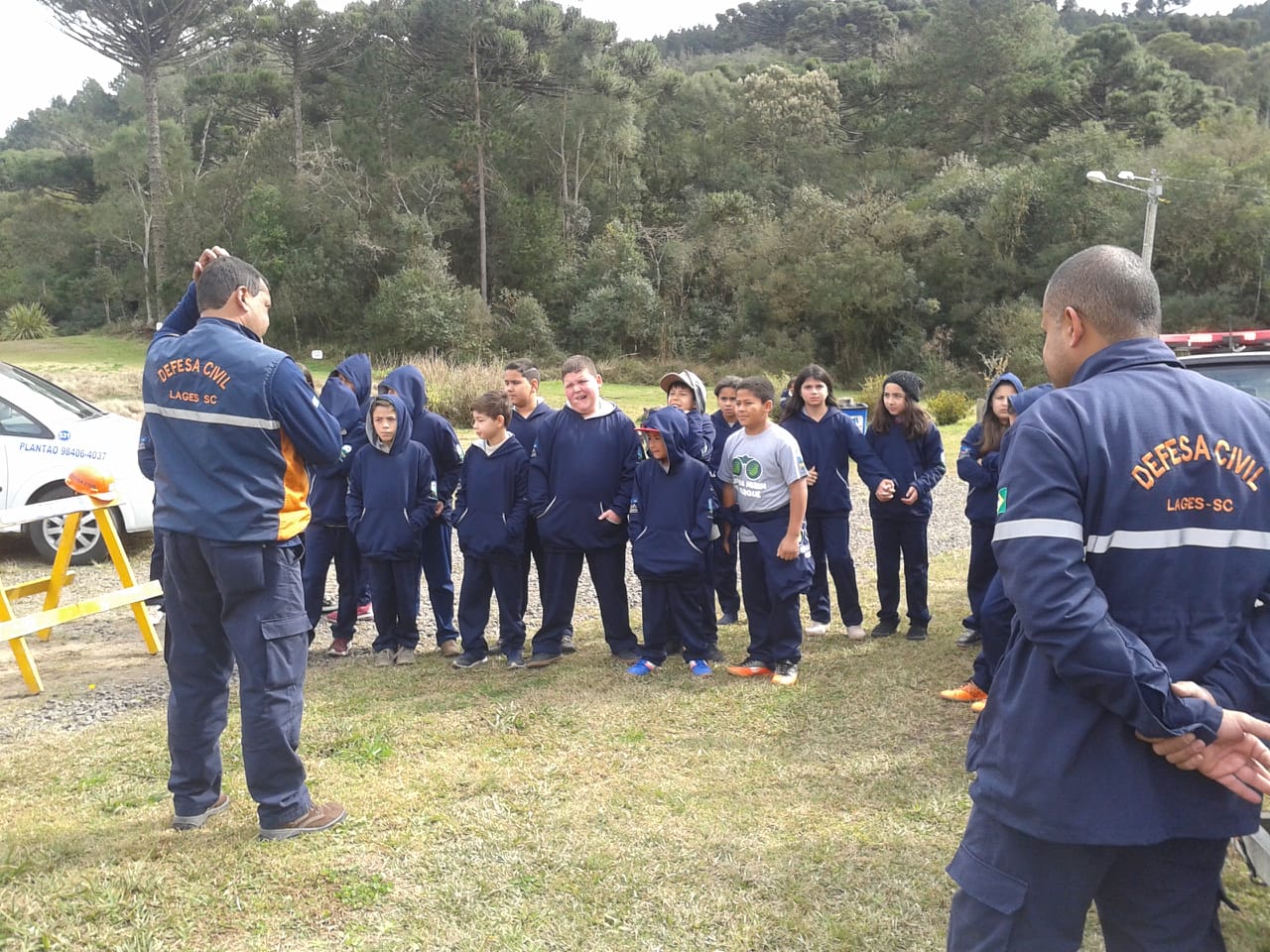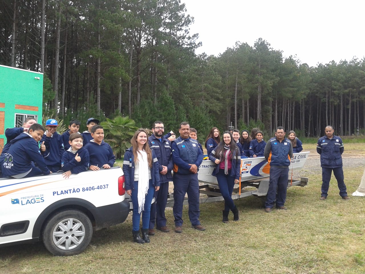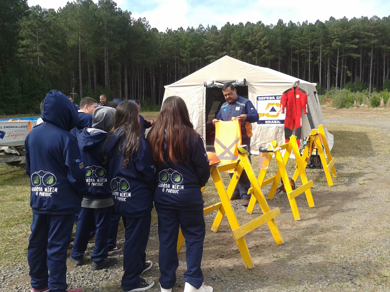 Pela manhã desta terça-feira (20 de agosto), os alunos do curso do Projeto Guarda Mirim, do Parque Natural João José Theodoro da Costa Neto (Parnamul), receberam agentes da Defesa Civil de Lages, ministrantes de uma palestra sobre desastres naturais, medidas de prevenção e de diminuição e amenização das causas e impactos, aspectos relacionados a inundações, cheias, enchentes, deslizamentos de terra e vendavais, além de os profissionais dividirem dicas sobre primeiros-socorros e reforçarem o acionamento do 199 na ocorrência de algum problema deste tipo. Foram mostradas as viaturas utilizadas diariamente no trabalho da Defesa Civil, barcos, barraca de emergência e outros equipamentos e utensílios, como coletes e cavaletes de sinalização e roupa específica para salvamento aquático.
