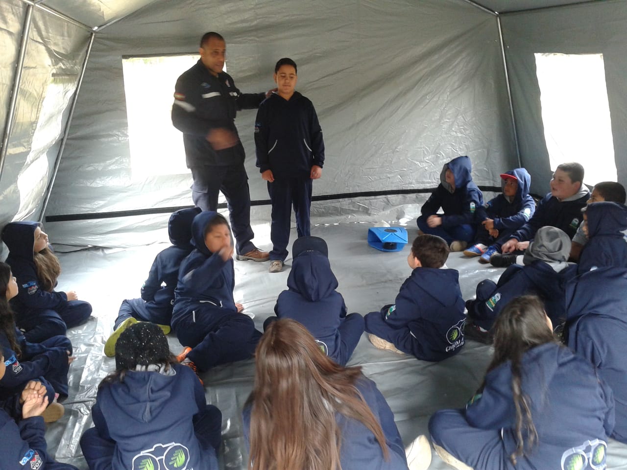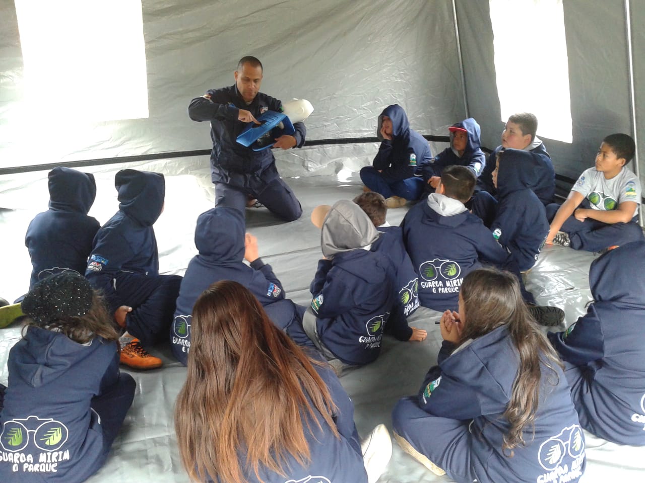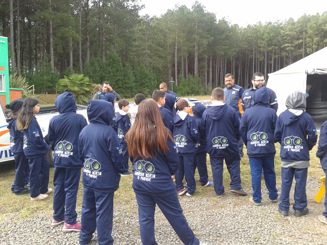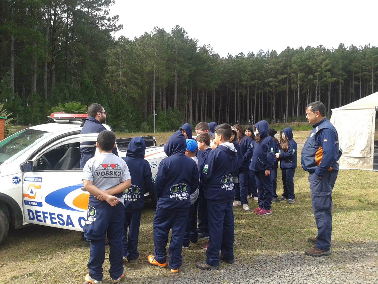 Pela manhã desta terça-feira (20 de agosto), os alunos do curso do Projeto Guarda Mirim, do Parque Natural João José Theodoro da Costa Neto (Parnamul), receberam agentes da Defesa Civil de Lages, ministrantes de uma palestra sobre desastres naturais, medidas de prevenção e de diminuição e amenização das causas e impactos, aspectos relacionados a inundações, cheias, enchentes, deslizamentos de terra e vendavais, além de os profissionais dividirem dicas sobre primeiros-socorros e reforçarem o acionamento do 199 na ocorrência de algum problema deste tipo. Foram mostradas as viaturas utilizadas diariamente no trabalho da Defesa Civil, barcos, barraca de emergência e outros equipamentos e utensílios, como coletes e cavaletes de sinalização e roupa específica para salvamento aquático.