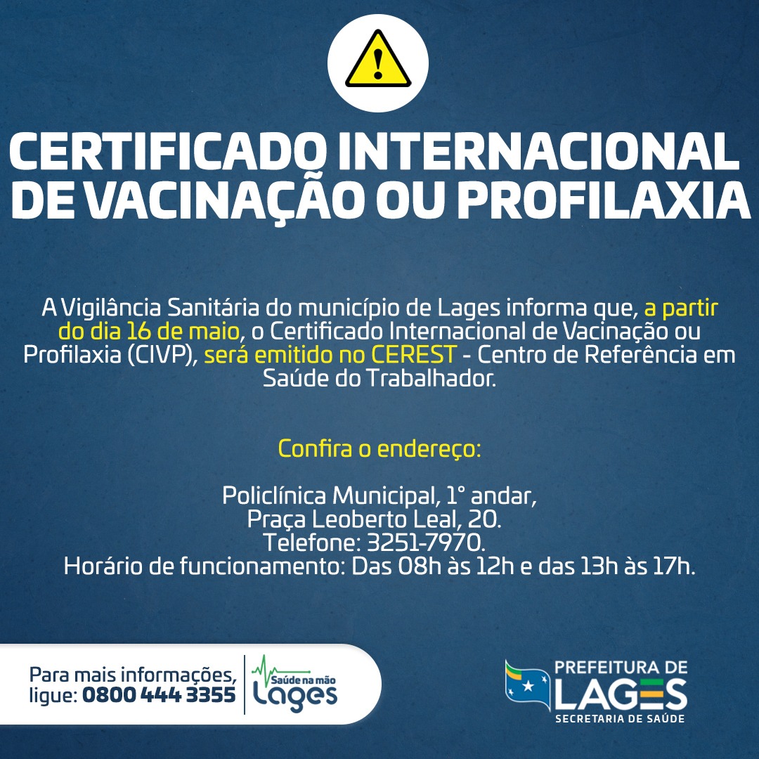 Documento que comprova a vacinação contra doenças, o Certificado Internacional de Vacinação ou Profilaxia (CIVP) será emitido no Centro de Referência em Saúde do Trabalhador (Cerest) a partir do dia 16 de maio (segunda-feira), no Centro de Orientação para a Saúde do Viajante. O Cerest é um serviço público vinculado à Secretaria Municipal da Saúde, localizado no 1º andar da Policlínica Municipal de Especialidades Médicas Eneo Pacheco de Andrade, situada na Praça Leoberto Leal, nº: 20, centro da cidade de Lages. Ao público, o atendimento está prestado no Cerest de segunda a sexta-feira, das 8h ao meio-dia e das 13h às 17h.