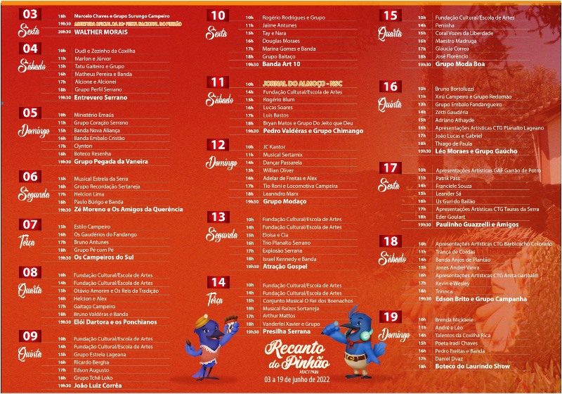 Lembrando que a abertura oficial da Festa Nacional do Pinhão será realizada no primeiro dia de Recanto (3 de junho), a partir das 19h30, no Calçadão da Praça João Costa.