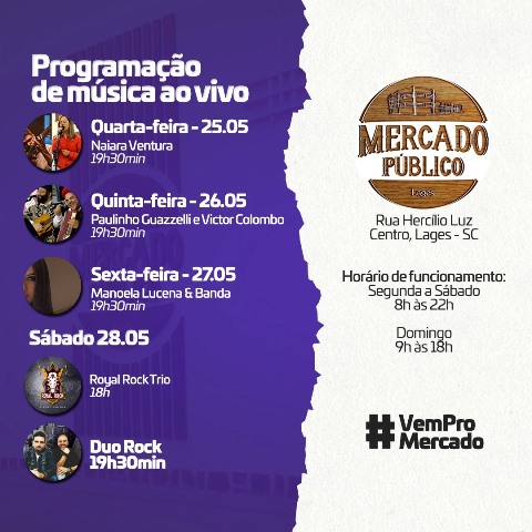 Programação musical no Mercado Público Municipal para este final de semana, iniciando nesta quarta-feira e seguindo até sábado, sempre prestigiando e valorizando os artistas locais.