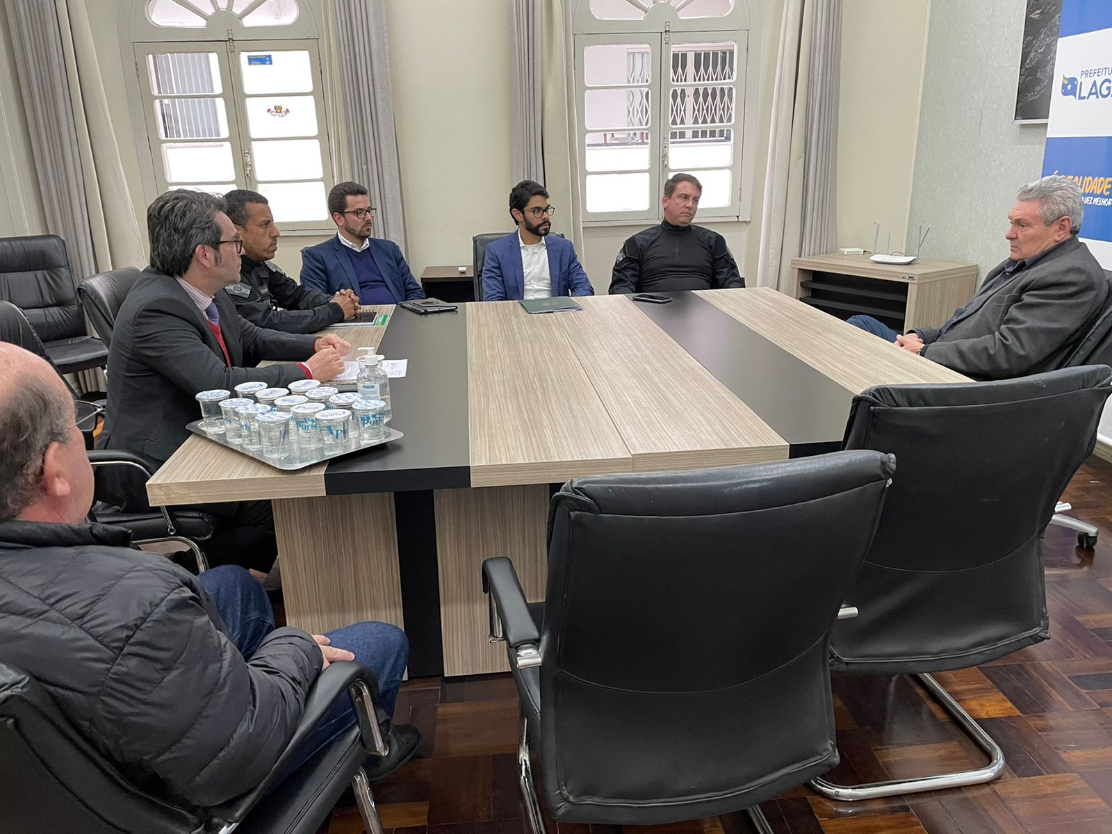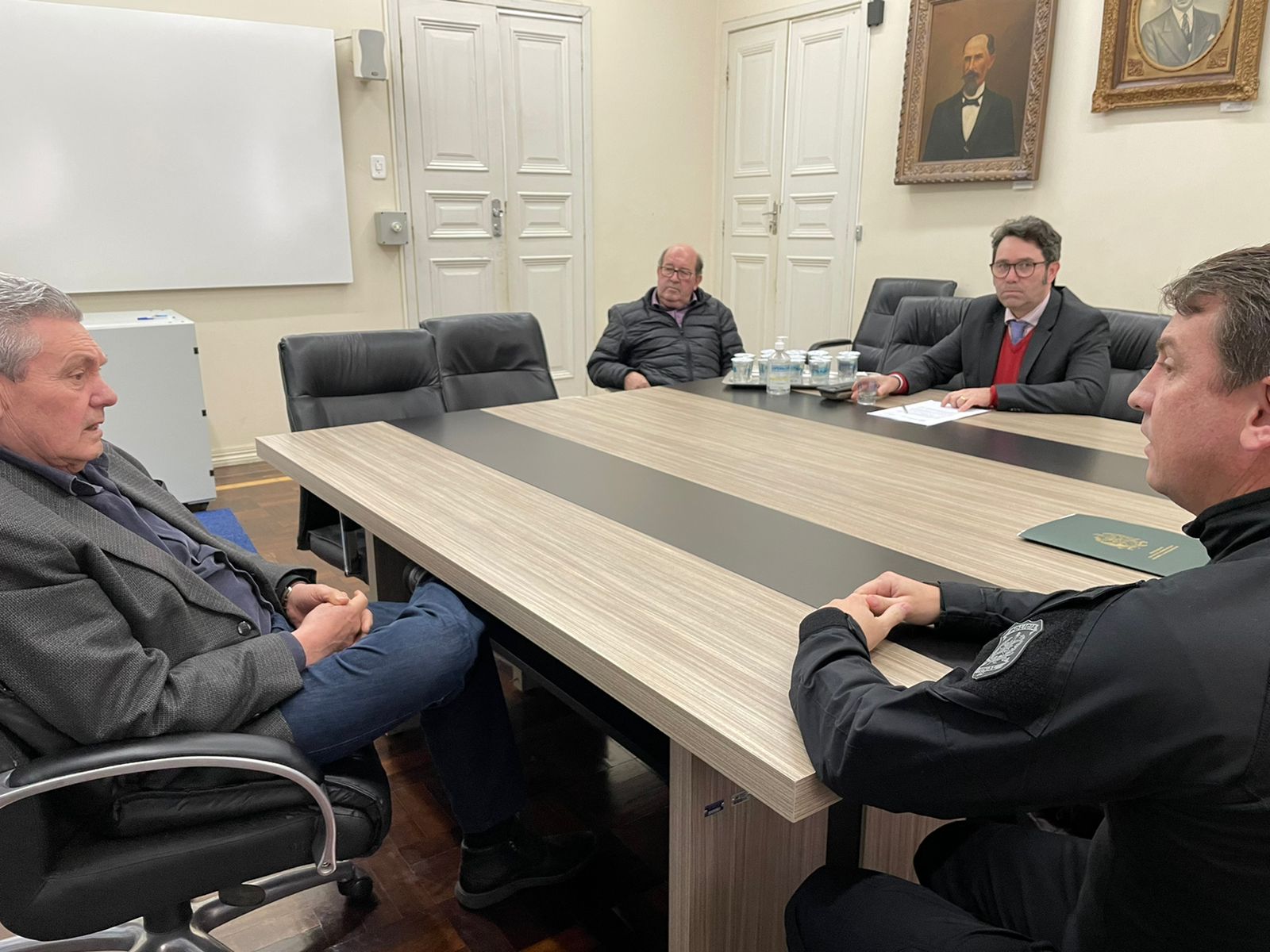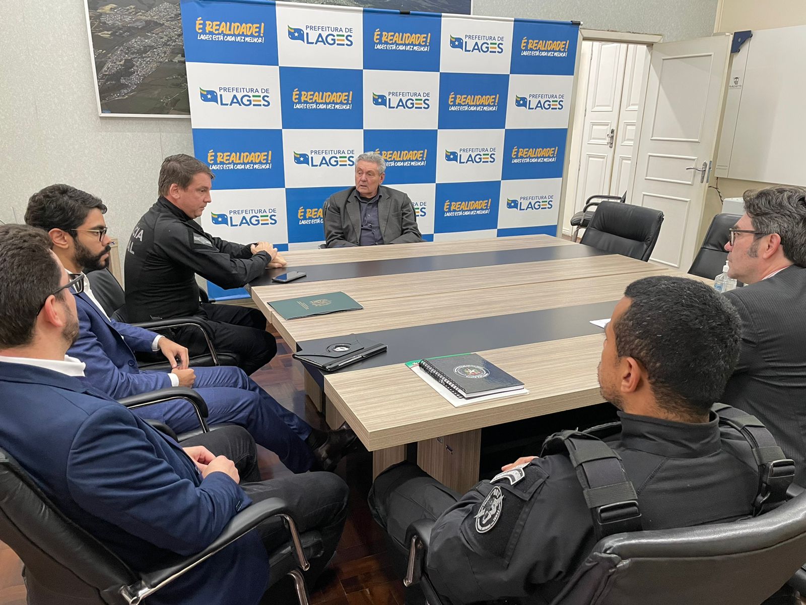 A expansão de oportunidades para reeducandos submetidos à pena privativa de liberdade esteve na pauta de conversações no Poder Executivo Municipal na tarde desta quinta-feira (9 de junho). O prefeito Antonio Ceron recebeu, em seu gabinete, o secretário de Estado da Administração Prisional e Socioeducativa, Edemir Alexandre Camargo Neto; o diretor do Presídio Masculino de Lages, Gilberto Vieira dos Santos, e outros profissionais do segmento governamental do Estado de Santa Catarina, além do representante da Comissão dos Direitos Humanos da Ordem dos Advogados do Brasil (OAB) de Lages, Afranio Camargo. Na ocasião foram efetivados ajustes burocráticos a respeito das tratativas e das restrições em razão do próximo período eleitoral.