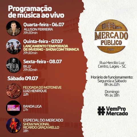 A movimentação no Mercado Público Municipal de Lages neste final de semana deve ser ainda maior, com duas atrações especiais no sábado, a Feijoada do MotoNeve, ao meio dia, e o show nacional às 19h, com Guto Graça Melo.