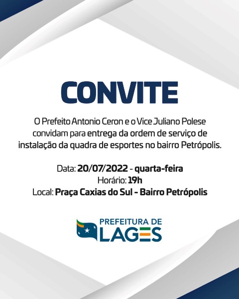 O prefeito Antonio Ceron e o vice Juliano Polese estão convidando a todos para o ato de entrega da ordem de serviço para instalação de uma quadra de esportes no Bairro Petrópolis.