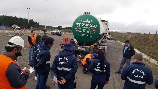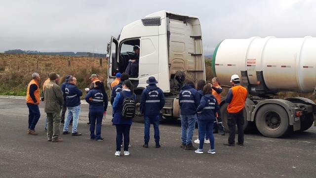 Na terceira lição presencial, os participantes da Defesa Civil, juntamente com integrantes de outras entidades como ANTT, Ibama, IMA e Polícia Rodoviária Federal e Vigilância Sanitária de Lages, estiveram no posto de Índios da BR 282 para a aula prática.