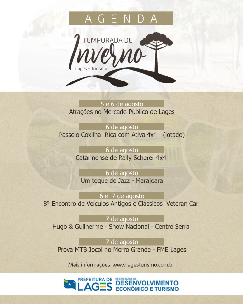 A Temporada de Inverno de Lages está acontecendo desde início de julho e oferece aos moradores e visitantes atrações musicais, atividades em meio à natureza como cavalgadas, trilhas, expedições off-road com veículos 4x4 na Coxilha Rica, gastronomia típica, entre outros eventos.