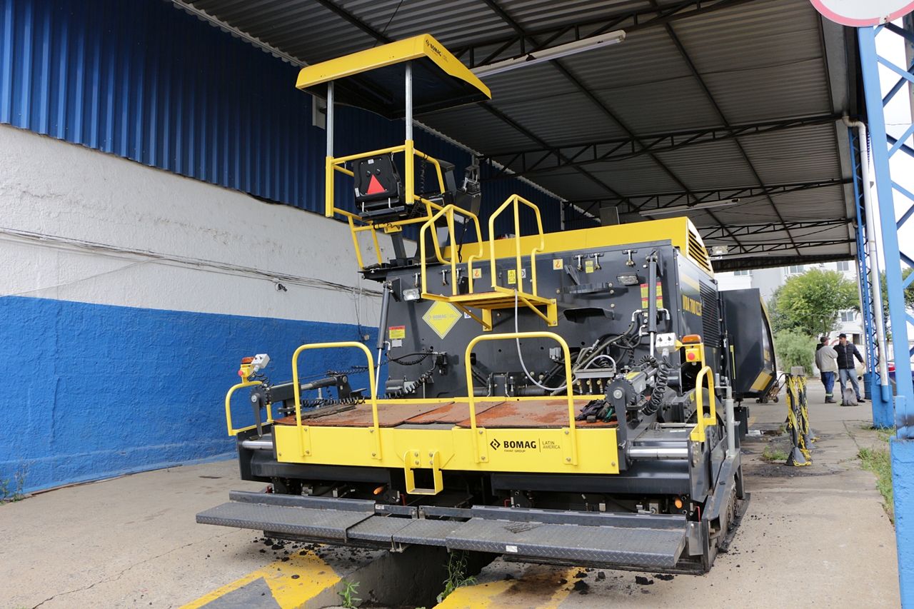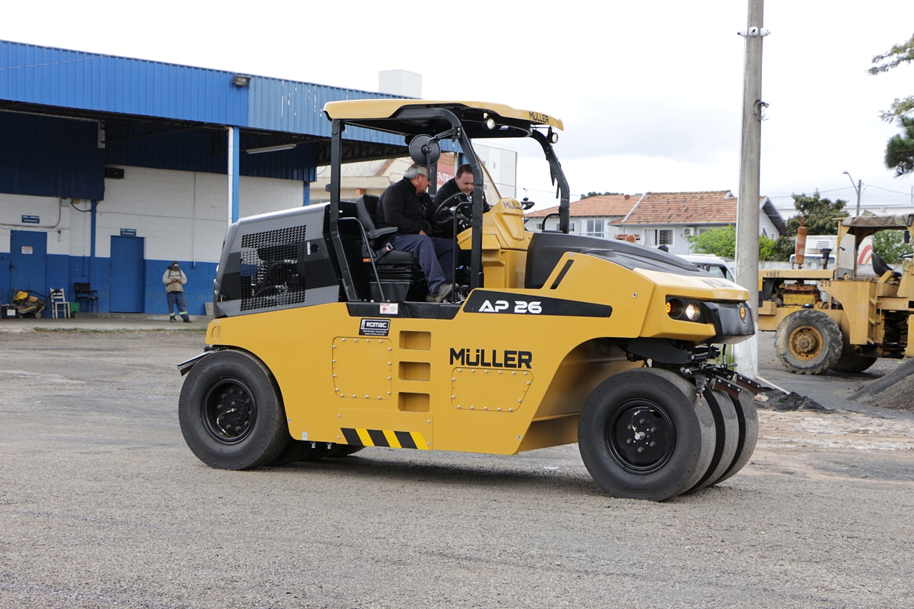 Rolo pneumático, também chamado rolo de pneus, é utilizado para a compactação e acabamento aumentando a resistência e durabilidade do asfalto. O novo equipamento adquirido tem painel totalmente digital.