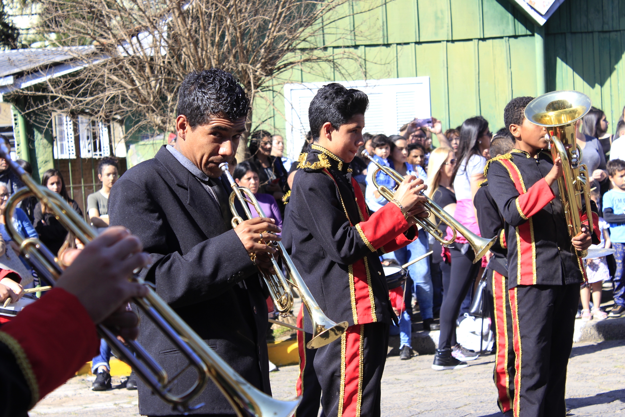 Bandas e fanfarras aproveitaram a oportunidade para mostrar o talento dos alunos com instrumentos de sopro e percussão