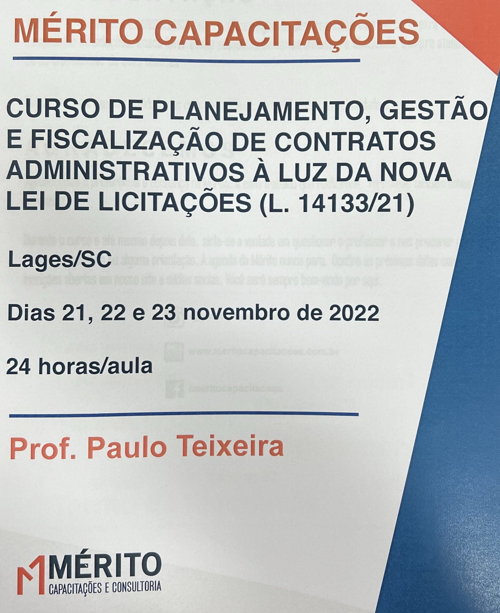 Paulo Teixeira, da empresa Mérito capacitações e consultoria, é o mentor do curso completo de planejamento, gestão e fiscalização de contratos administrativos (atualizado de acordo com as regras da Lei 14.133/21).